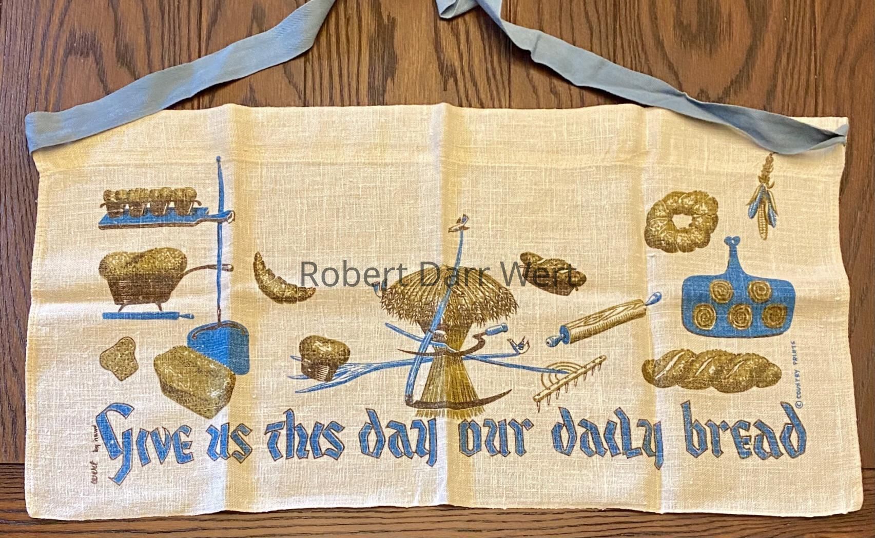 A three-color silkscreen print on natural linen. Illustration depicts tools and ingredients necessary for making bread, along with multiple examples of the finished product. The foundation of the composition is the first line of the Lord’s Prayer, “Give us this day our daily bread”, a recurrent theme in Wert’s designs, appearing on placemats, table squares, table runners and tablecloths.