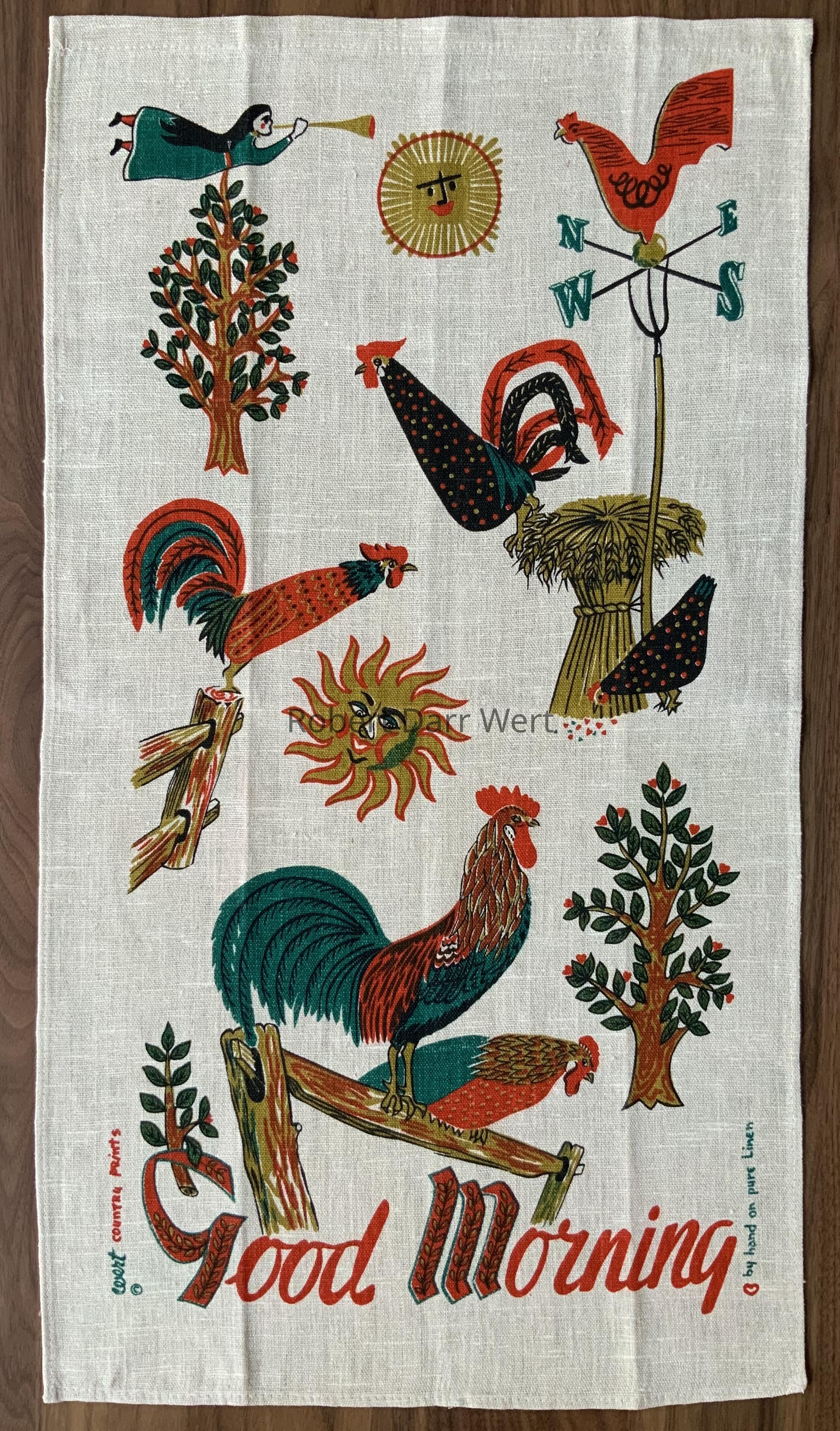 Good Morning is a recurrent theme in Wert’s work and can be found on table linens, tiles and art prints. This print was offered on both off-white and natural linen. This example is printed on natural linen.
