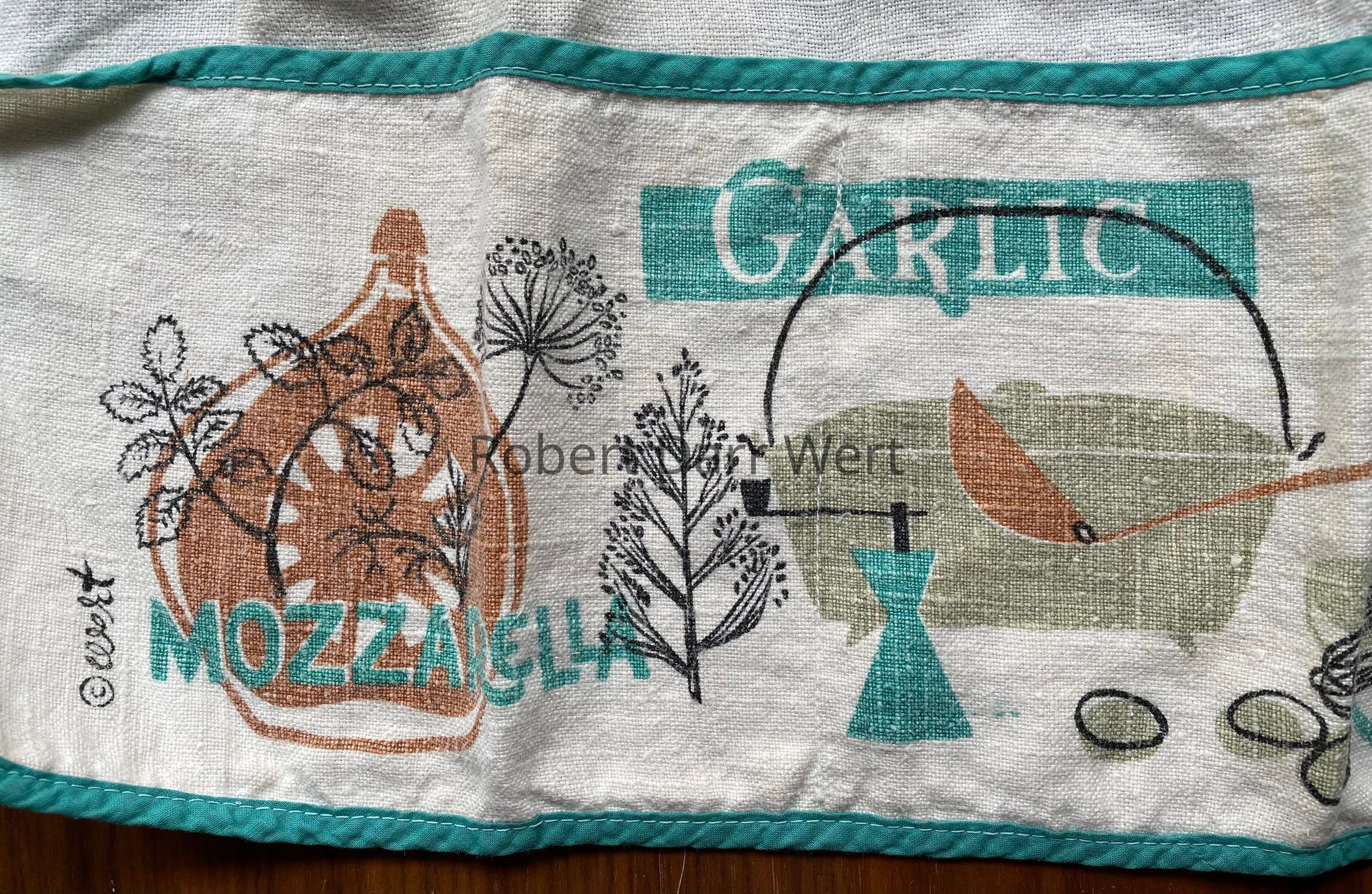 This apron is from Country Prints’ “Motif Gourmet” product line, a decidedly design-forward collection of modern compositions that steps away from his usual Americana themes; a highly stylized composition of type and imagery typical of the 1960’s.