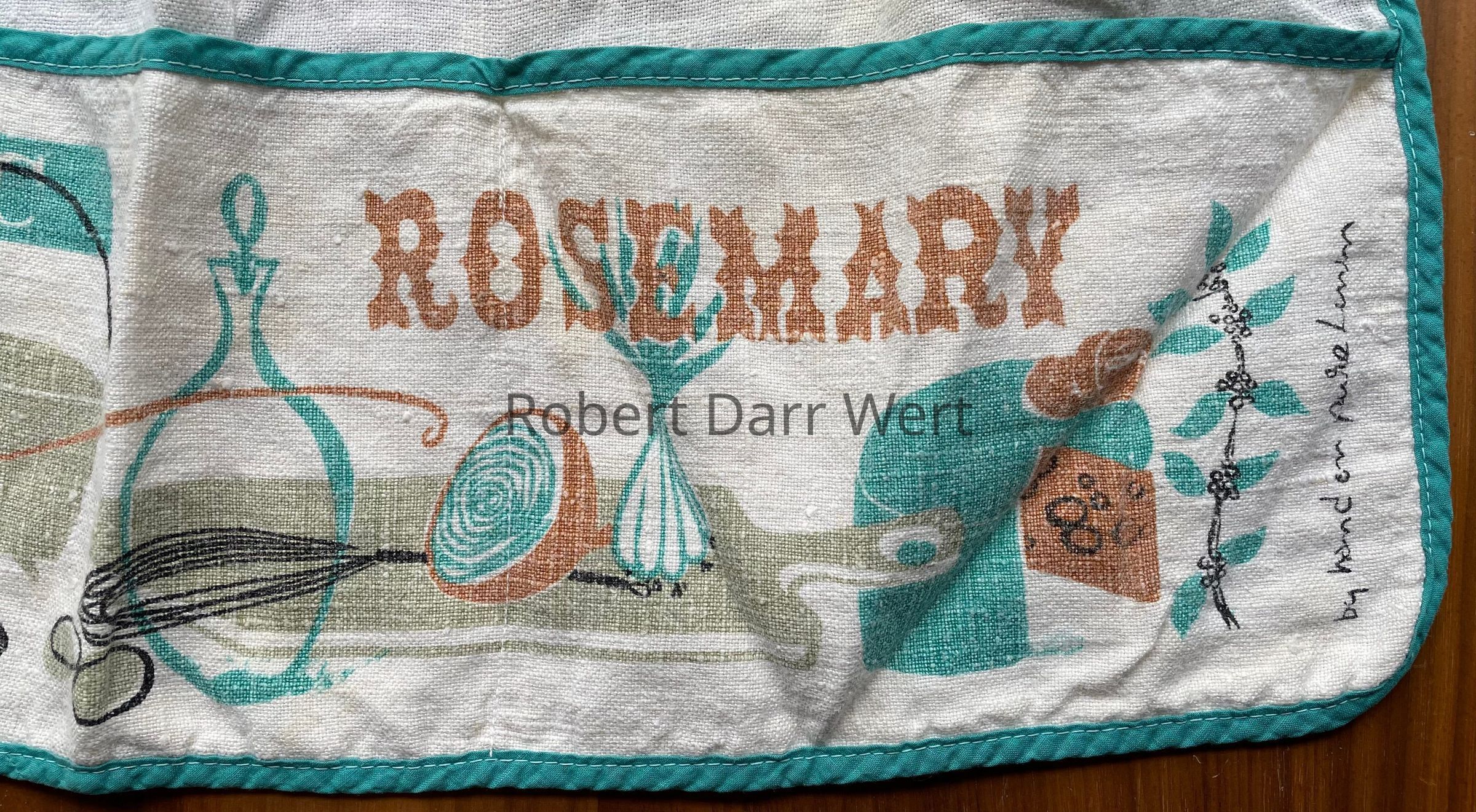 An apron with a four-color silkscreen print on off-white linen depicting herbs, cheese, scallions, onions, cooking implements, and the words, “Mozzarella”, “Garlic”, and “Rosemary”.