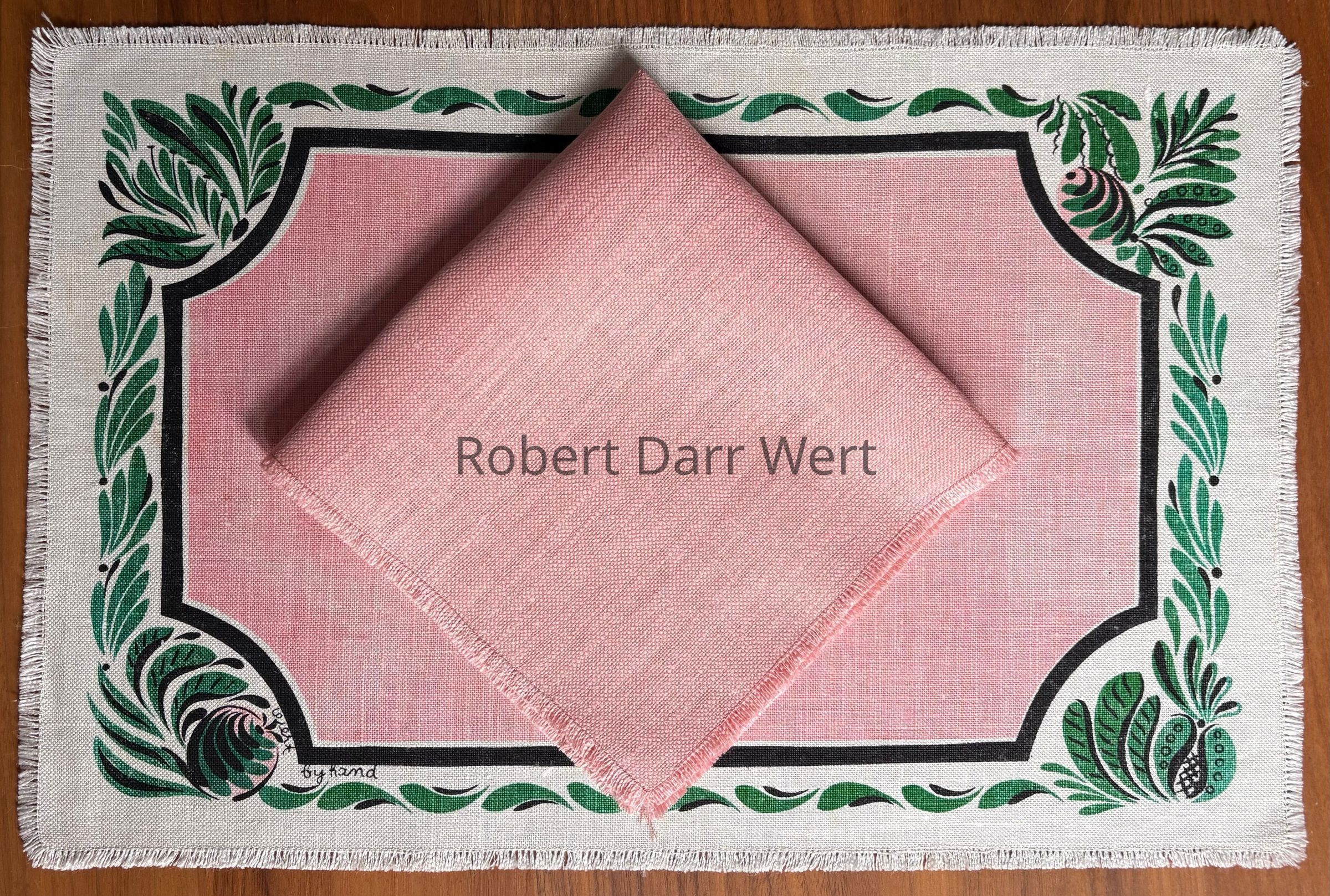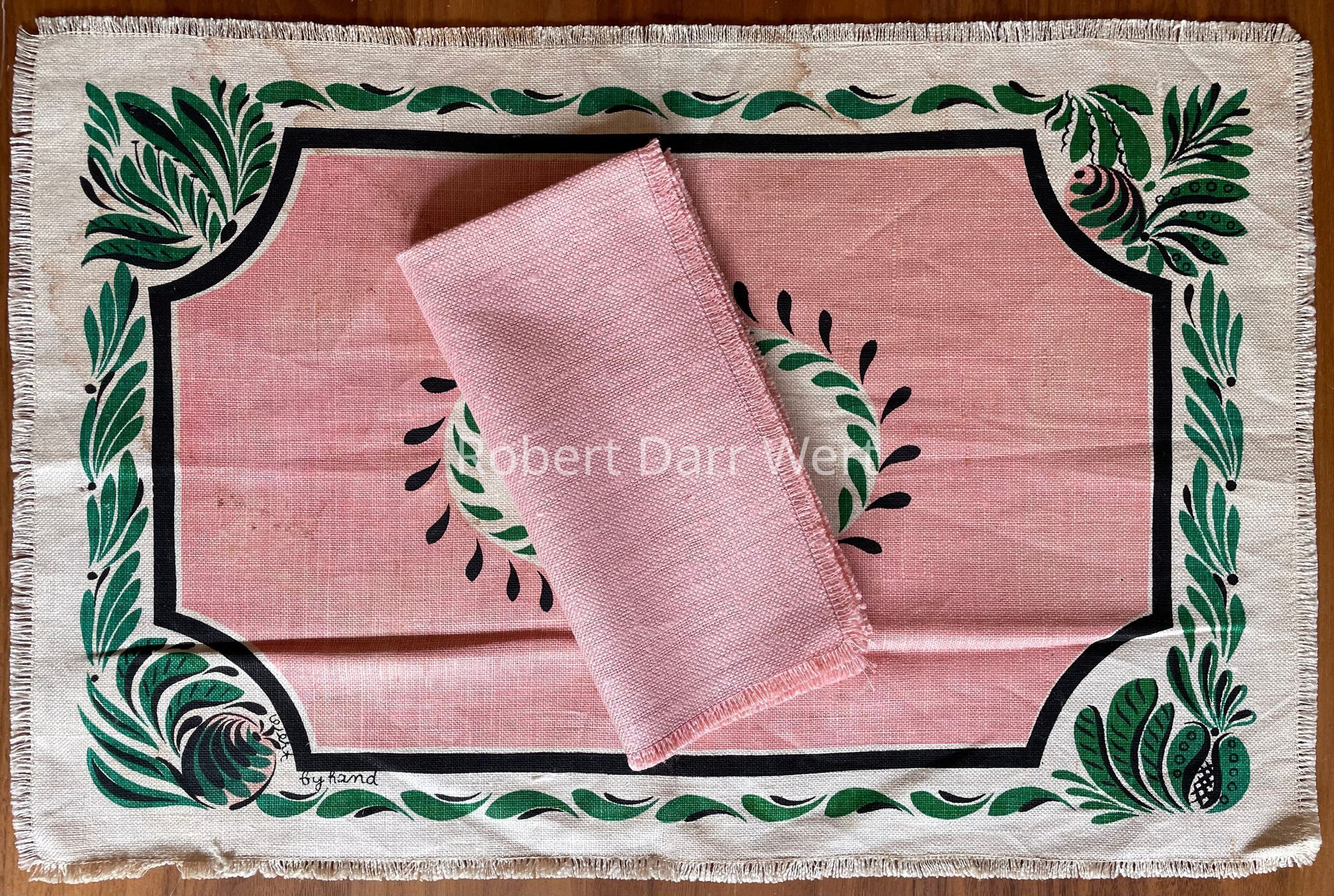 A placemat with a three-color silkscreen print on white linen depicting plant life and borders rendered in the manner of painted tin or toleware. It was produced in at least three colorways: yellow, aqua, or pink.