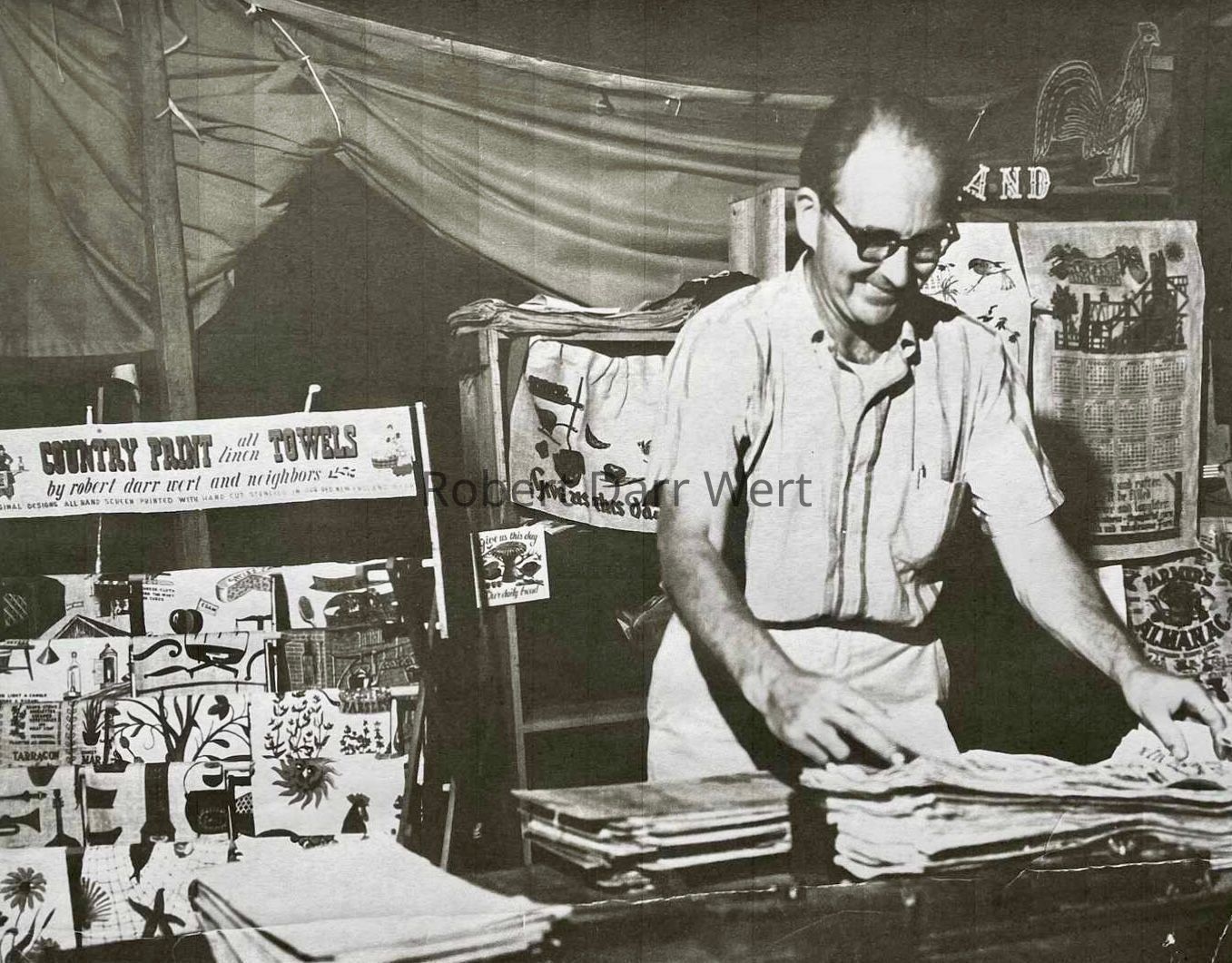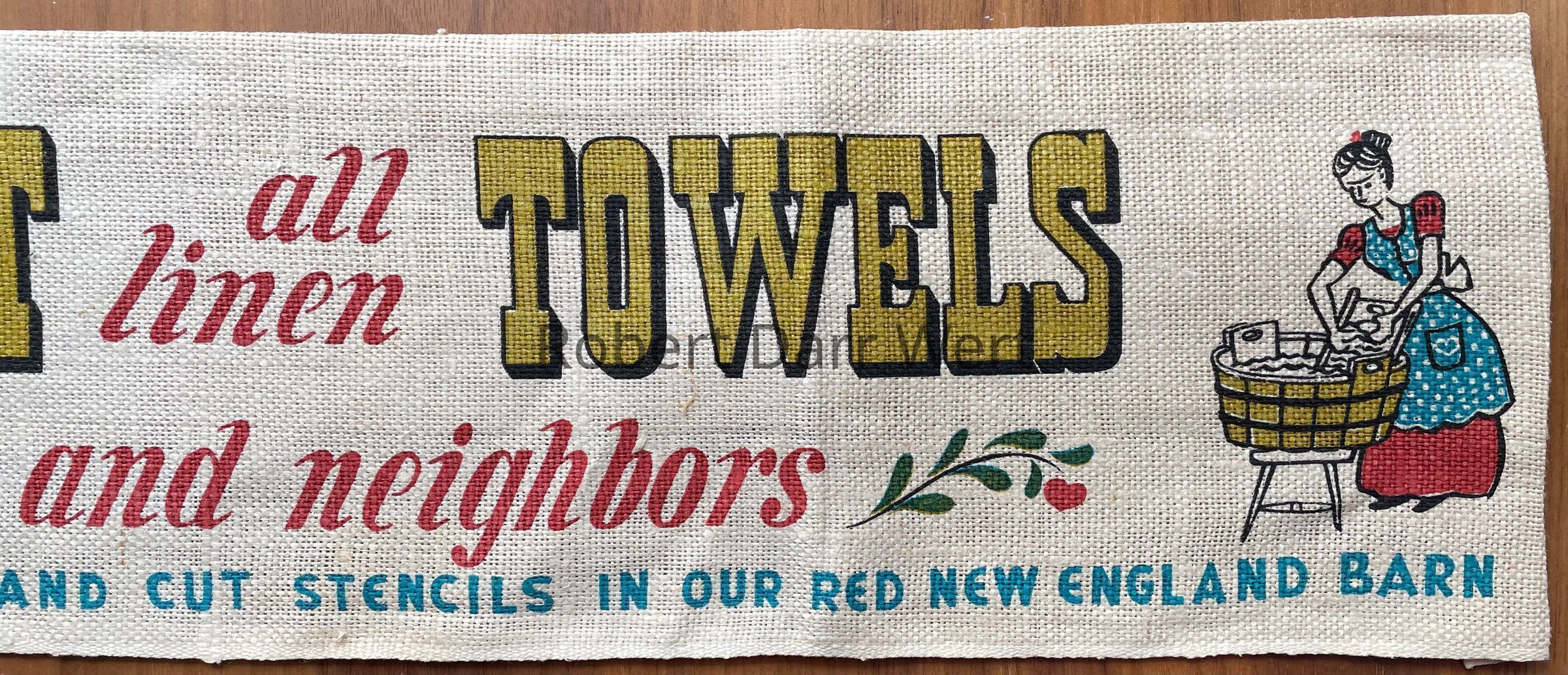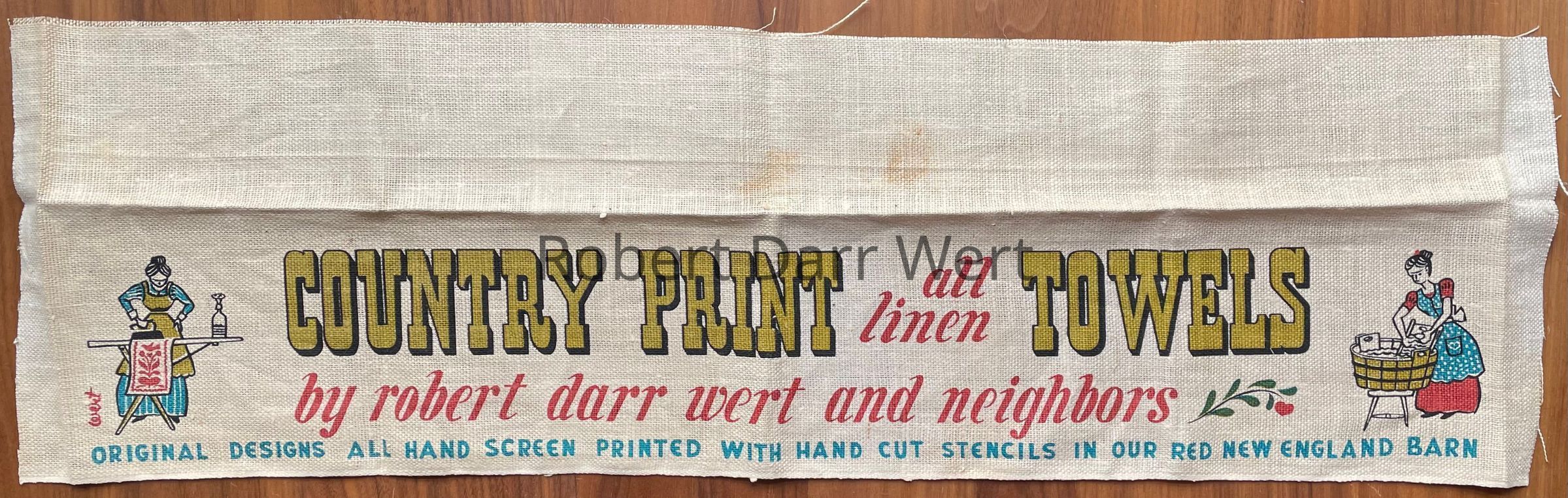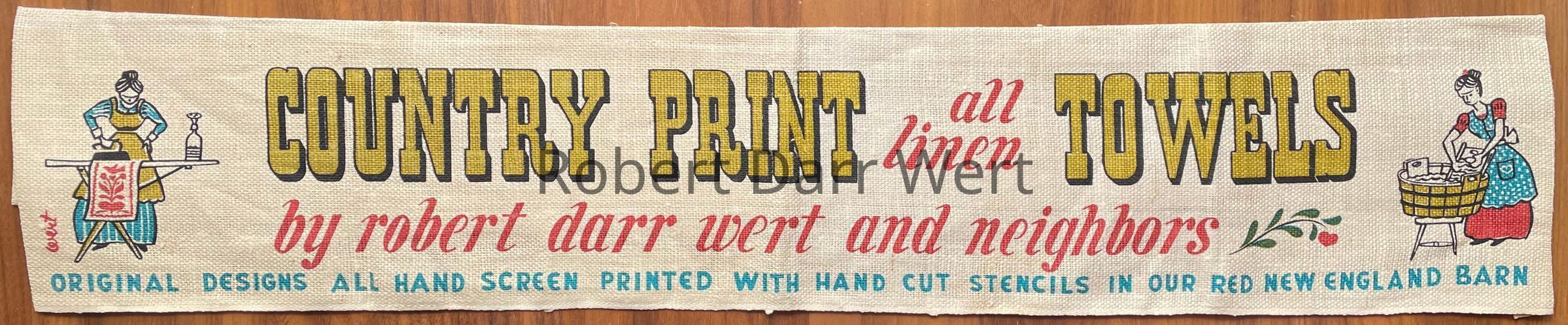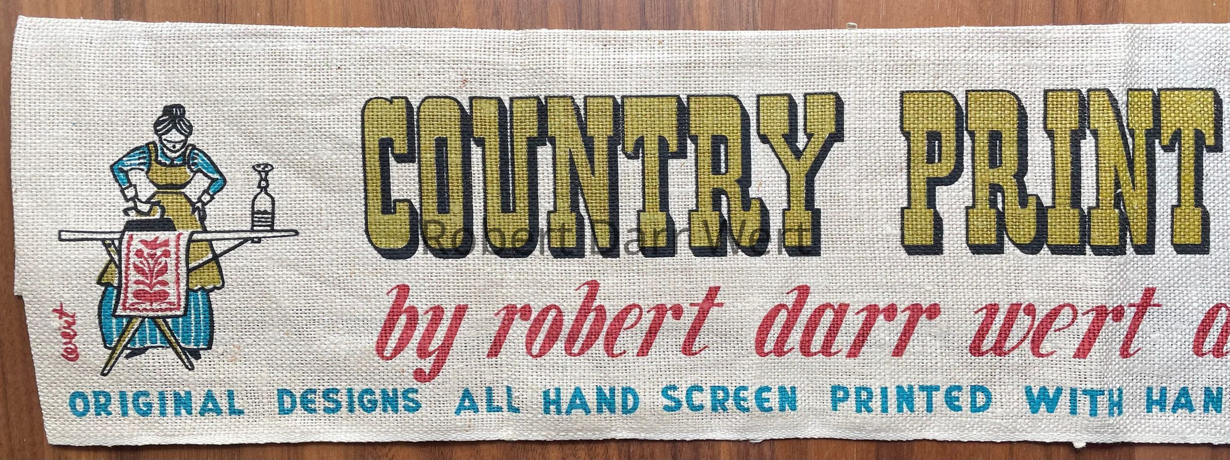 A four-color silkscreen print on off-white linen with Country Prints’ brand identifiers, and illustrations of two women in long dresses washing and ironing linens. See image below of banner in use.