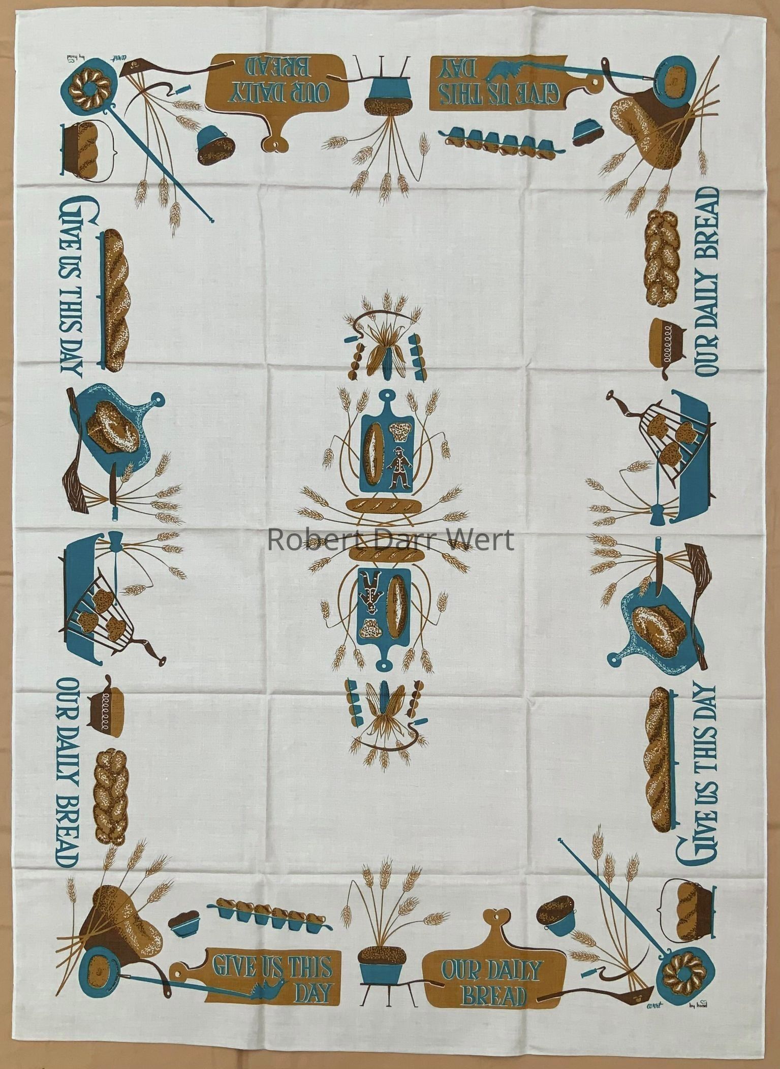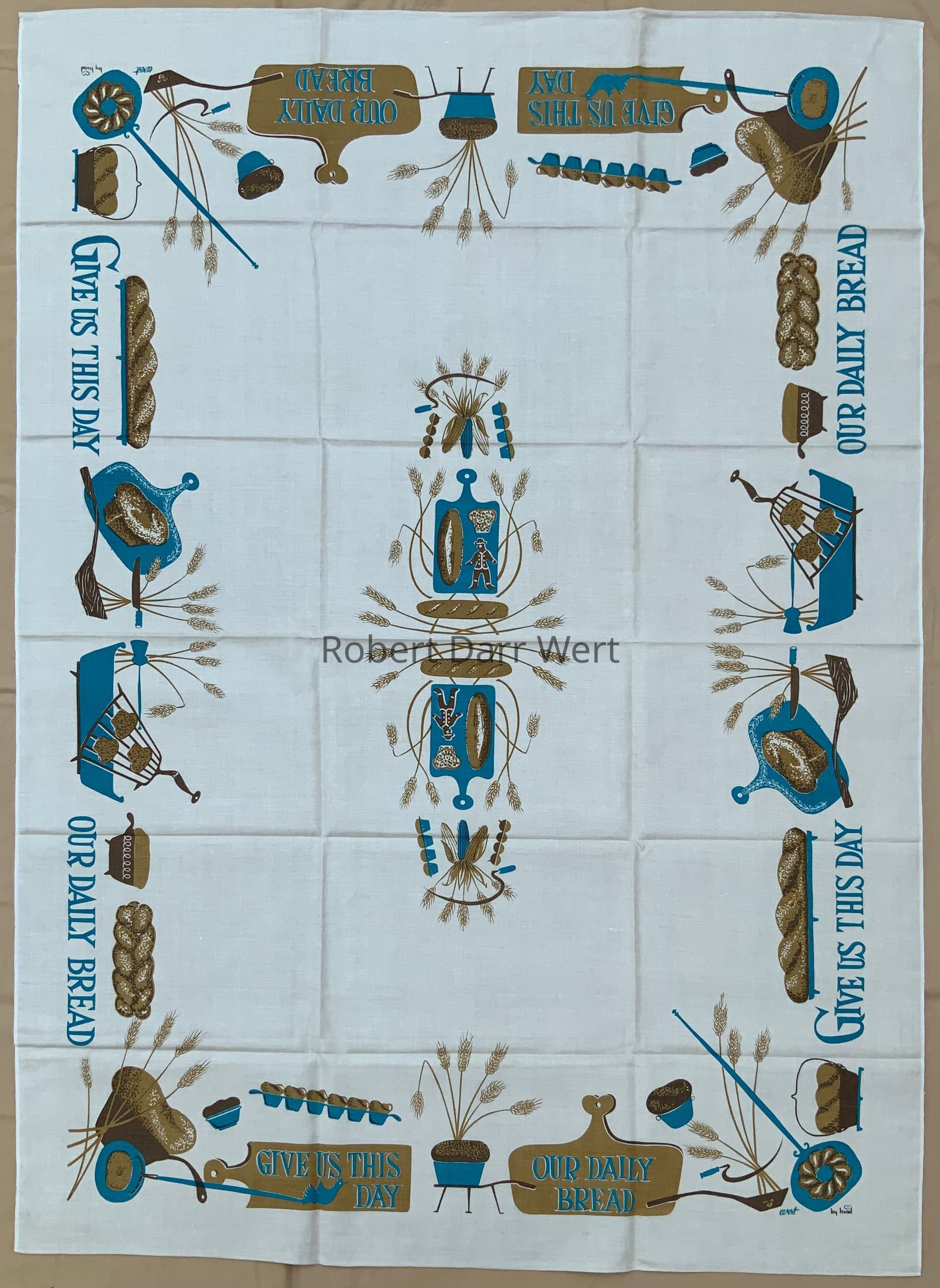 A tablecloth with a three-color silkscreen print on natural linen depicting numerous types of bread and baking implements supporting the phrase from the Lord’s Prayer, “Give us this day our daily bread”.