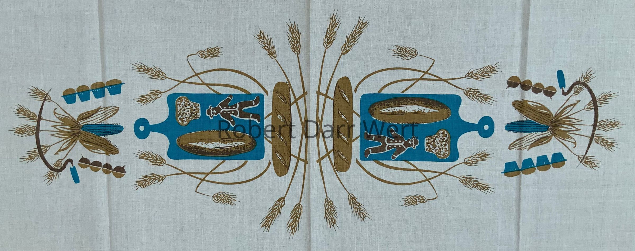 This tablecloth is listed in the January 1960 Country Prints price list in two sizes (52” x 52”, 52” x 72”), and two colorways (brick red or blue). It appears in the brochure “Mat Sets by Robert Darr Wert/Country Prints”, c.1960.