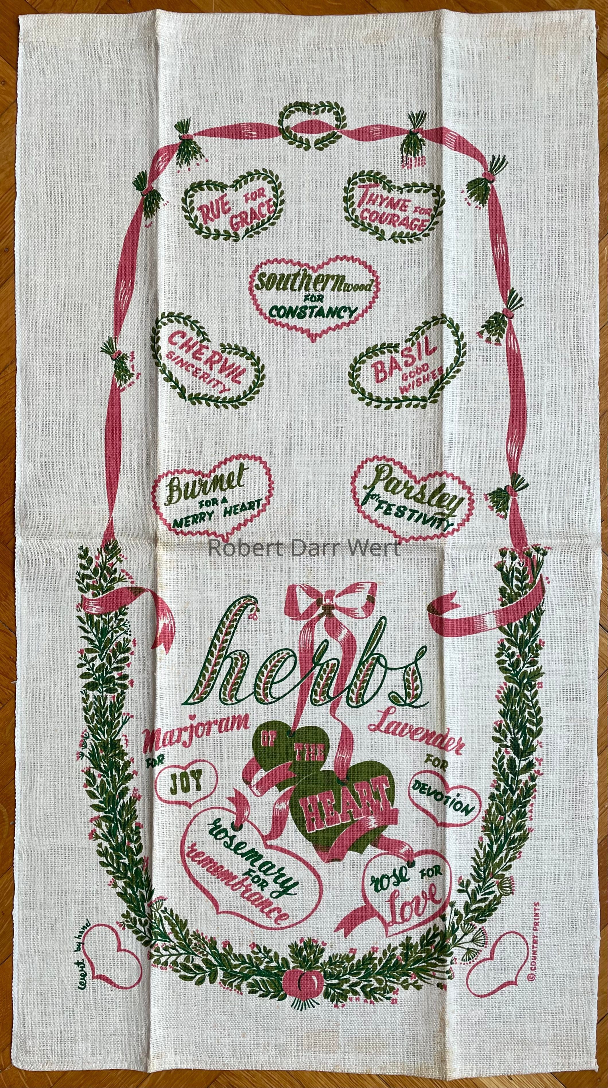 A three-color silkscreen print on off-white linen depicting herbs in illustration and text with their symbolism related to love. The title, Herbs of the Heart, appears in the lower half of the design, within the area bordered by an herb garland.