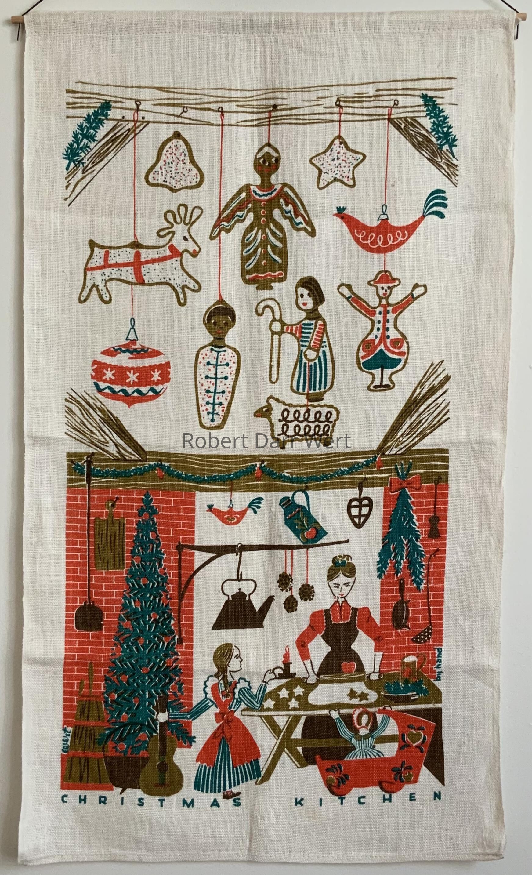 A four-color silkscreen print on off-white linen depicting an early American kitchen, Christmas cookies being made, and finished Christmas cookies hung as decorations.