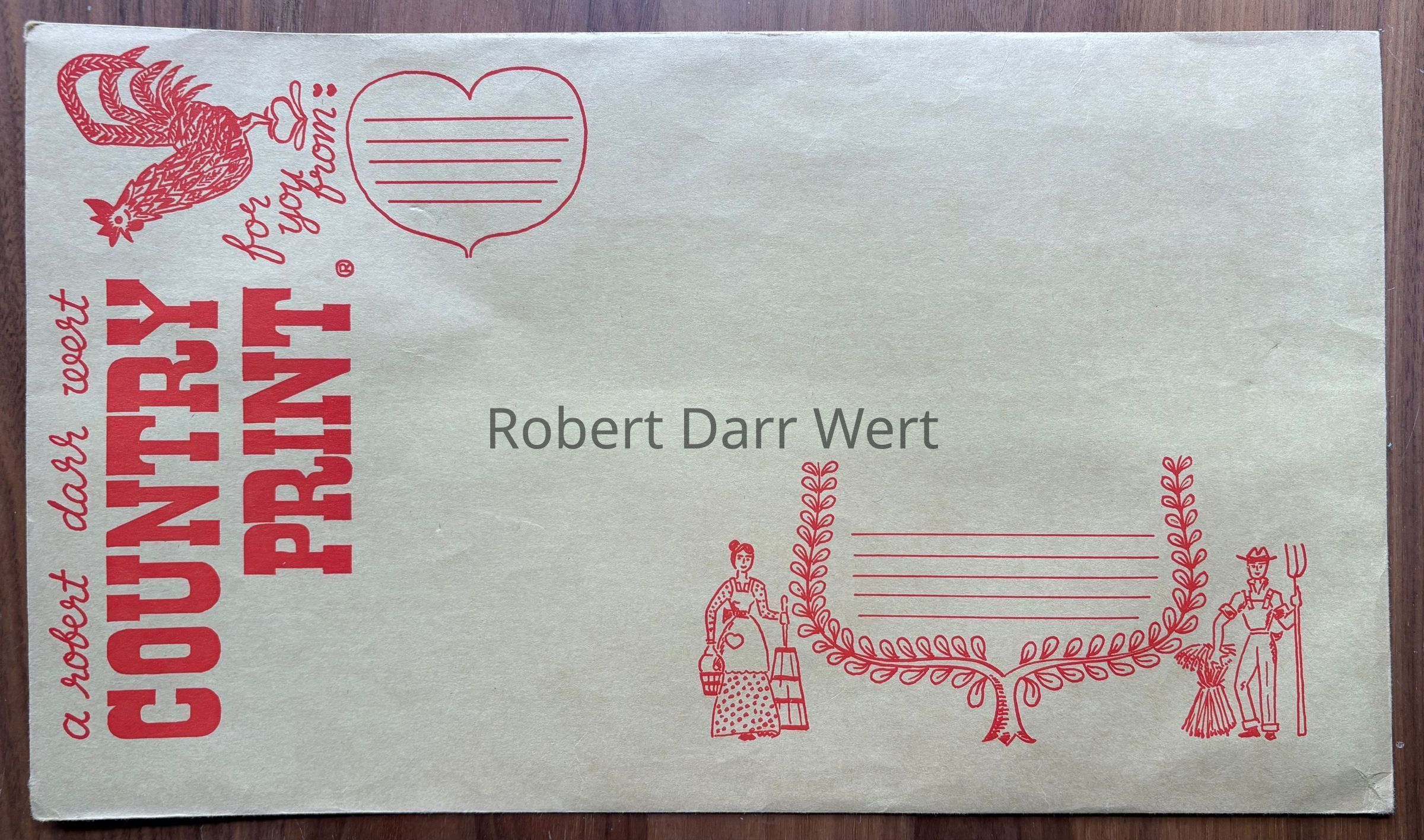 Face of envelope: “a robert darr wert COUNTRY PRINT ® for you from:”, followed by a return address field enclosed in a heart. See images for additional text and artwork.Dimensions