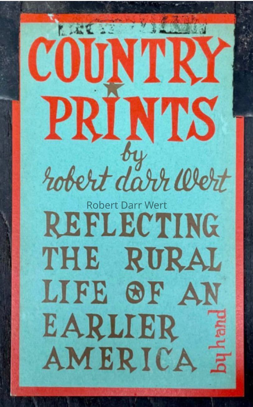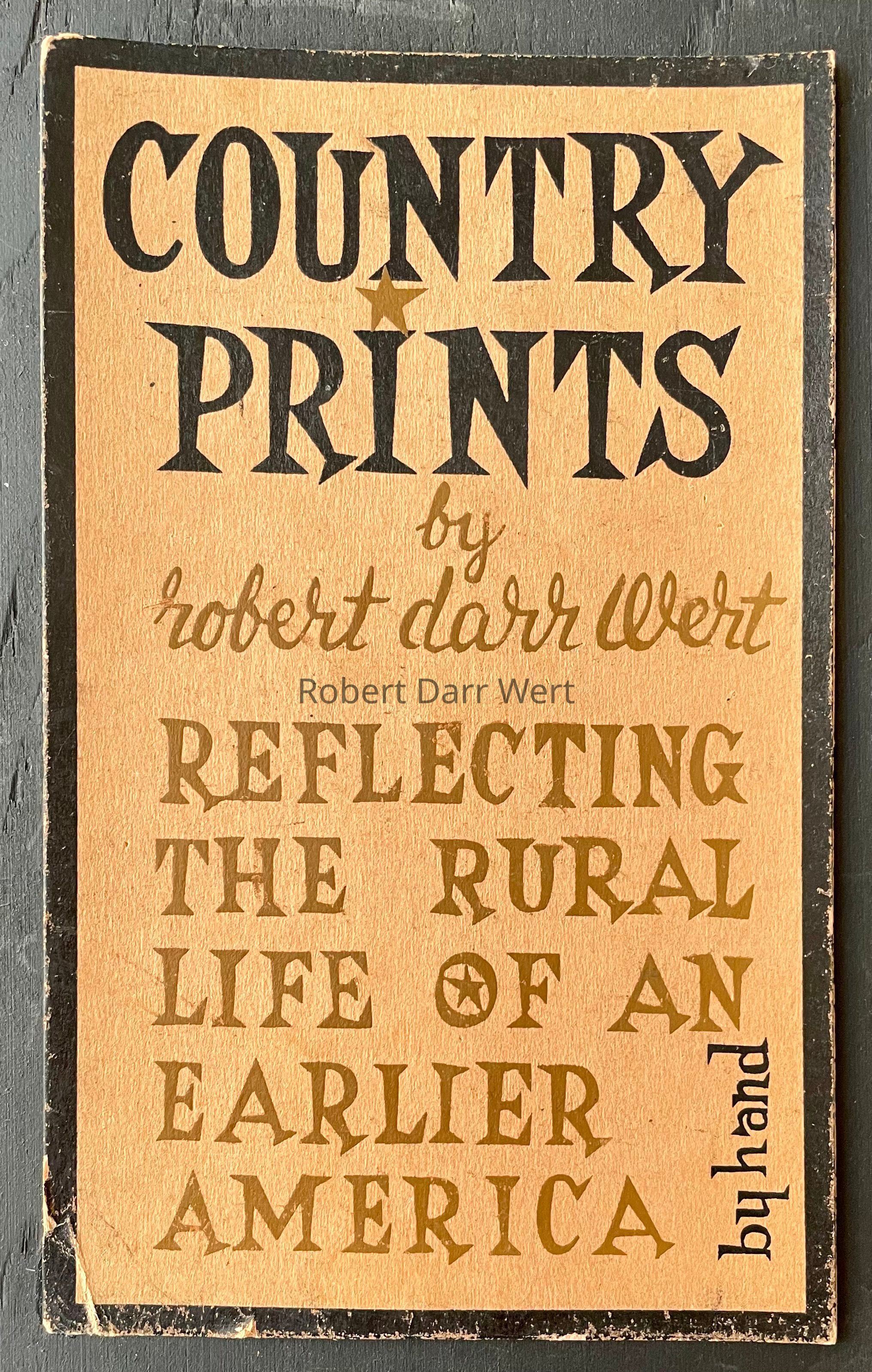 A c.1950 Country Prints story card with a two-color silkscreen print on off-white cardstock. Typically attached to the back of framed prints. Text reads, “COUNTRY PRINTS by robert darr wert, REFLECTING THE RURAL LIFE OF AN EARLIER AMERICA, by hand”. This card has been documented in two colorways; see images.Made/Created