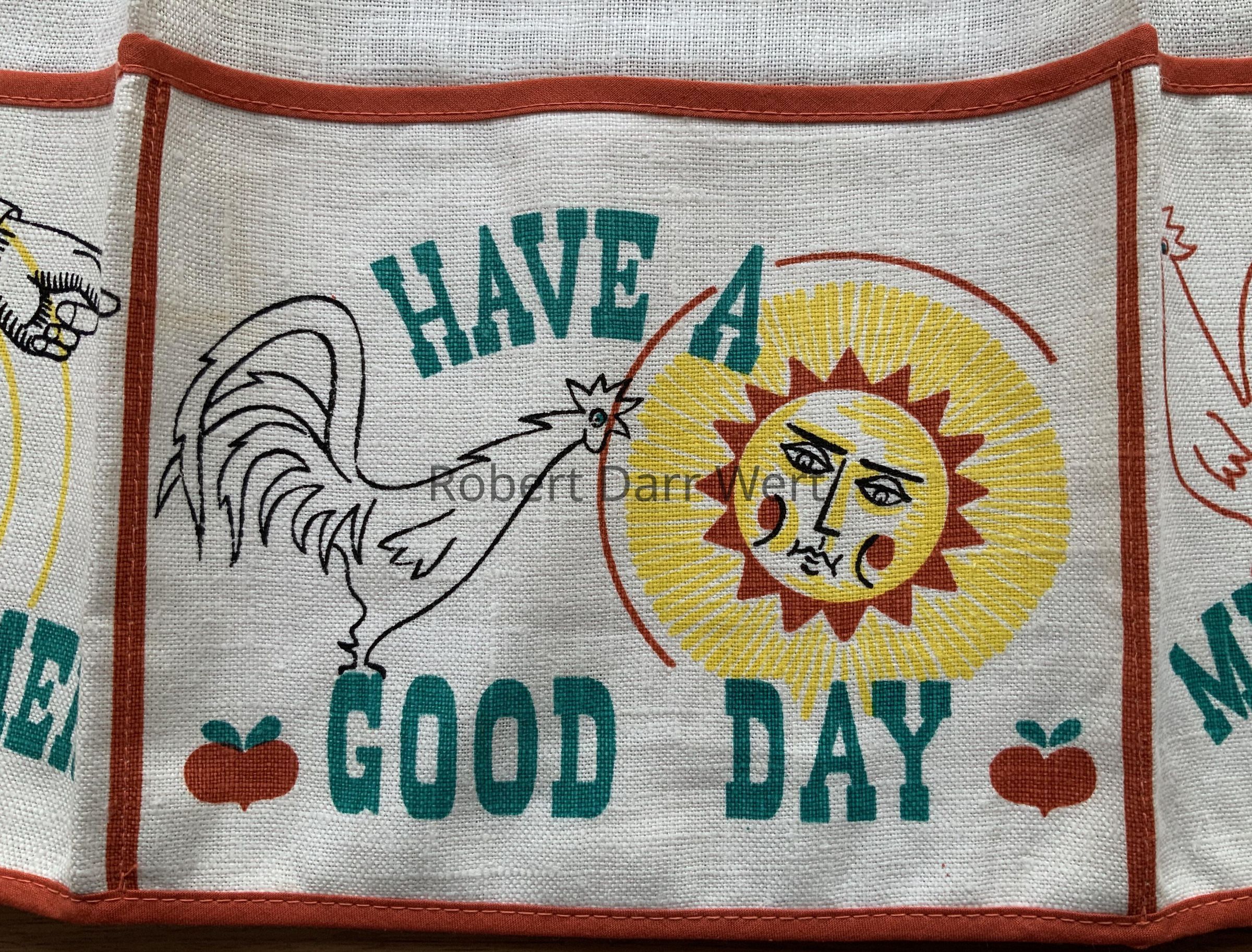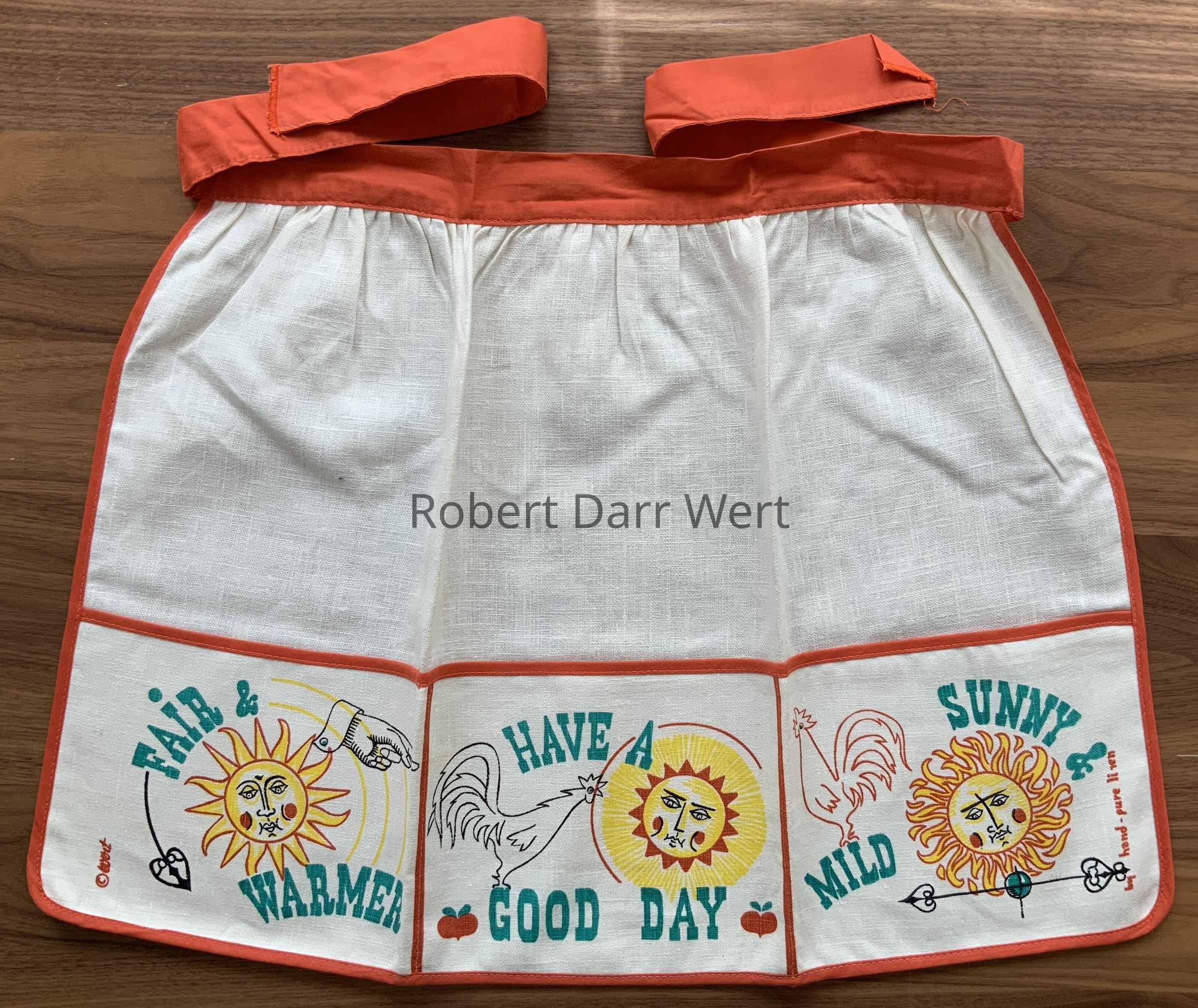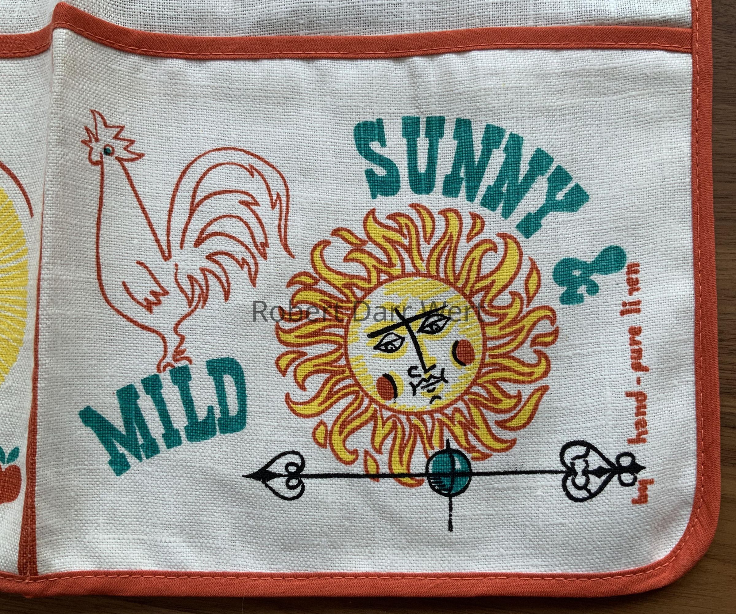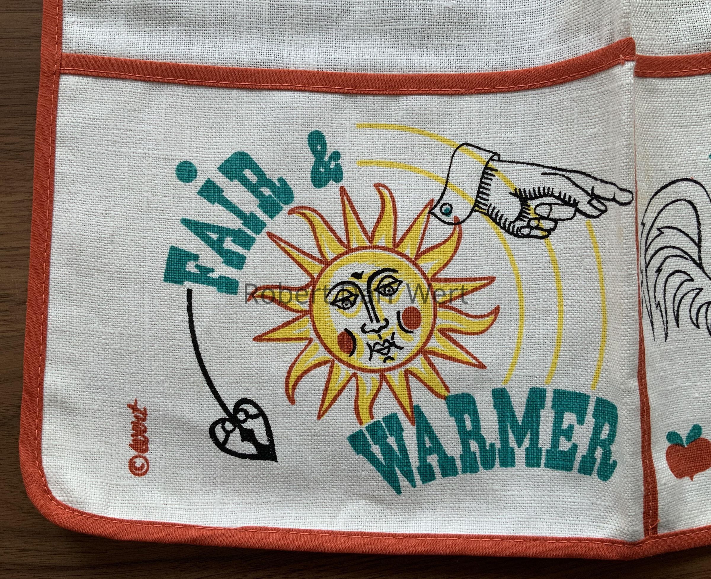A four-color silkscreen print on off-white linen depicting the rising sun and roosters greeting the new day. On the apron pockets playful text enlivens the composition: forecasts of “Fair & Warmer”, and “Sunny & Mild”, along with the expression, “Have a Good Day”. Wert’s apple hearts appear in the center panel, and hearts are seen on the ends of the weathervane directional arrows. Edges and seams are finished with red-orange bias tape to match print.