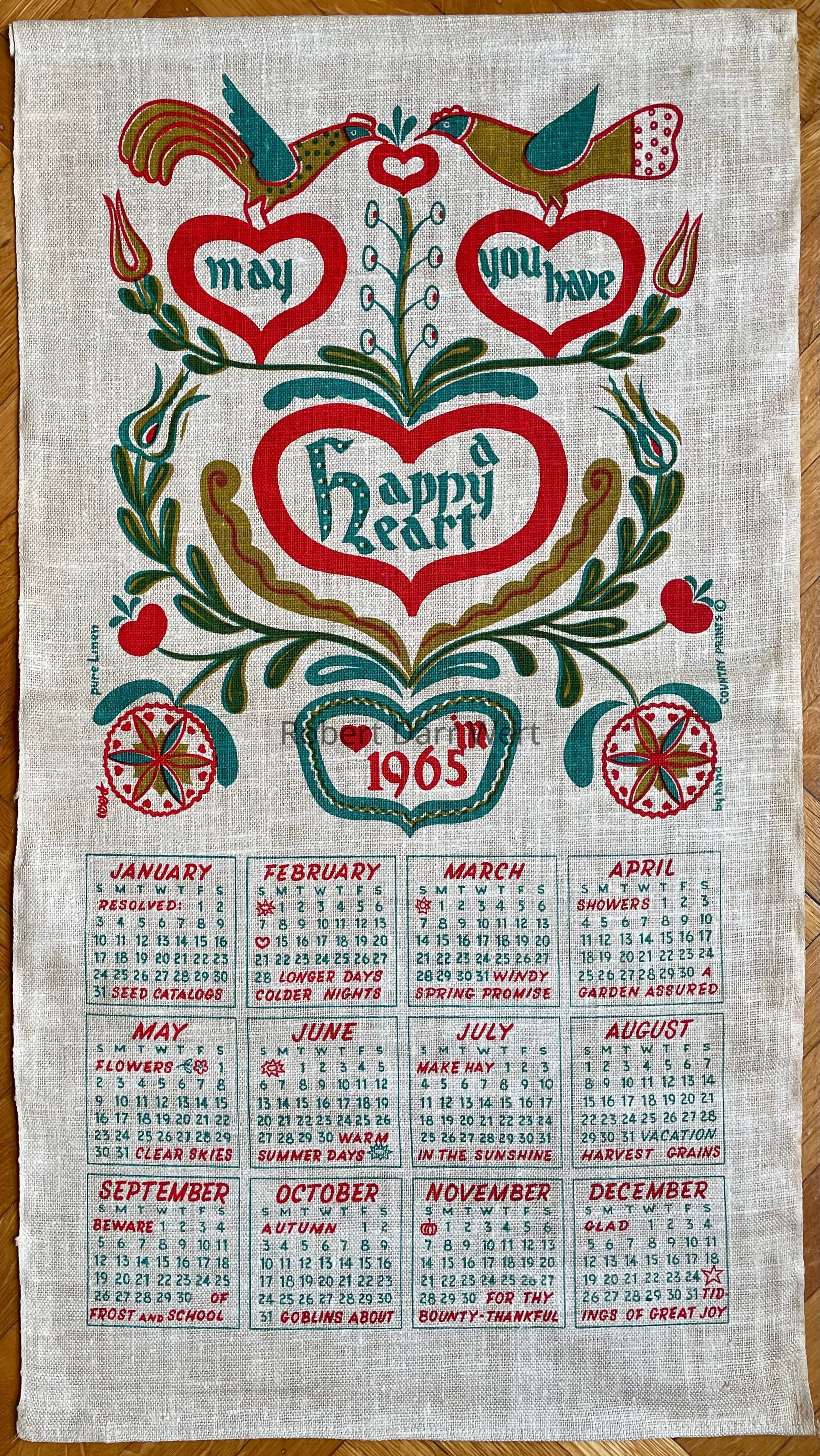 A three-screen/four-color silkscreen print on natural linen depicting Wert’s interpretation of Pennsylvania “Dutch” folk art, with the text, “May you have a happy heart in 1965”. Open days on calendar months have quirky notations like, “Longer days, colder nights”, in February.