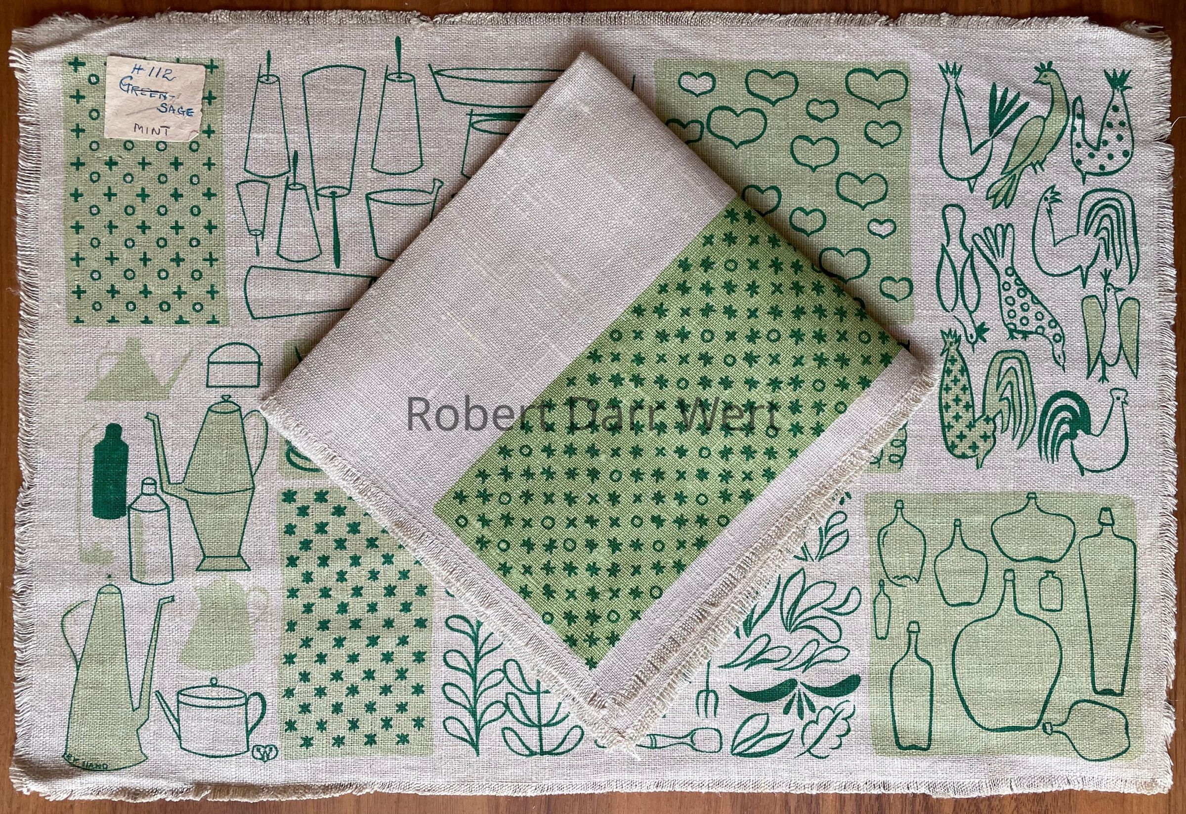 A two-color silkscreen print on off white linen rendered in a sketchbook-like manner depicting signature items in Wert’s design catalog: wooden ware; wrought iron cooking tools; roosters, hens and doves; calligraphic scrolls; trailing vines; hearts; and simple patterns reminiscent of calico prints. Matching square napkins are also printed with a pattern reminiscent of calico prints; see images.