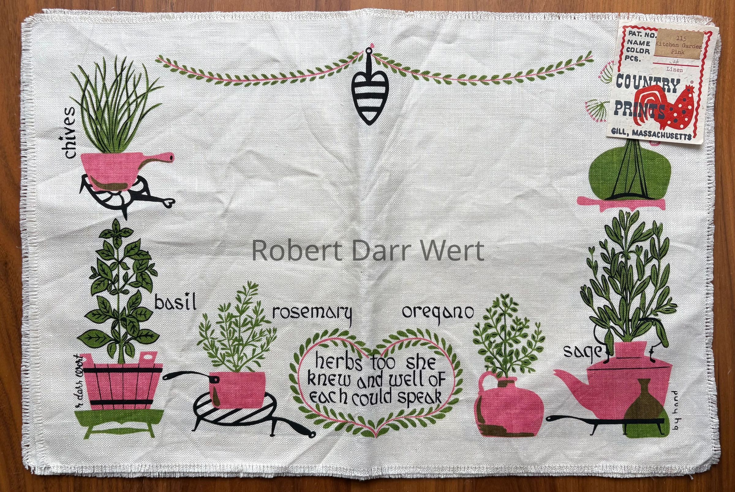 This placemat set is listed in the January 1960 Country Prints price list in two colorways (pink or brown), and appears in the c.1960 brochure “Mat Sets by Robert Darr Wert/Country Prints”, c.1960; see images.Made/Created