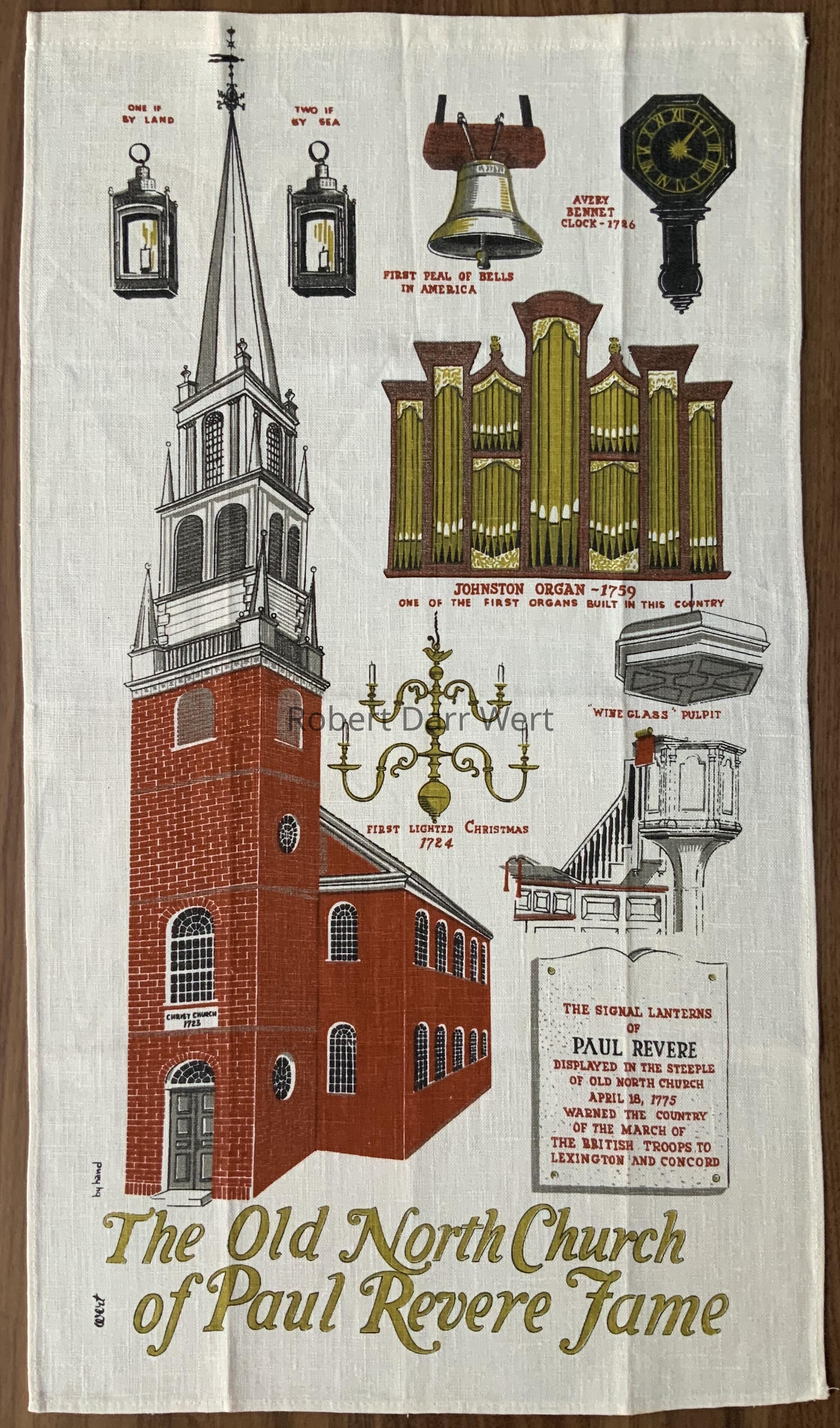 A four-color silkscreen print on bleached white linen depicting “The Old North Church of Paul Revere Fame” in Boston Massachusetts. The exterior of the church stands prominently, surround by interior elements such as the signal lanterns used by Revere, the church organ pipes, and the “wine glass” pulpit. This print is a custom commission for the souvenir shop at the Old North Church.