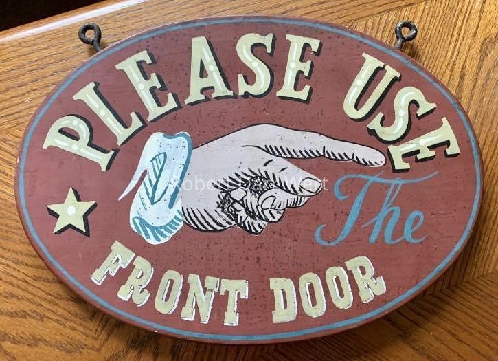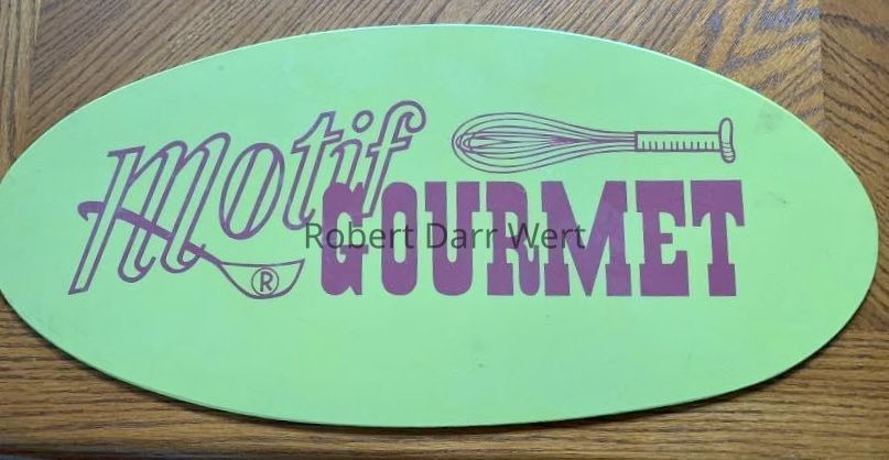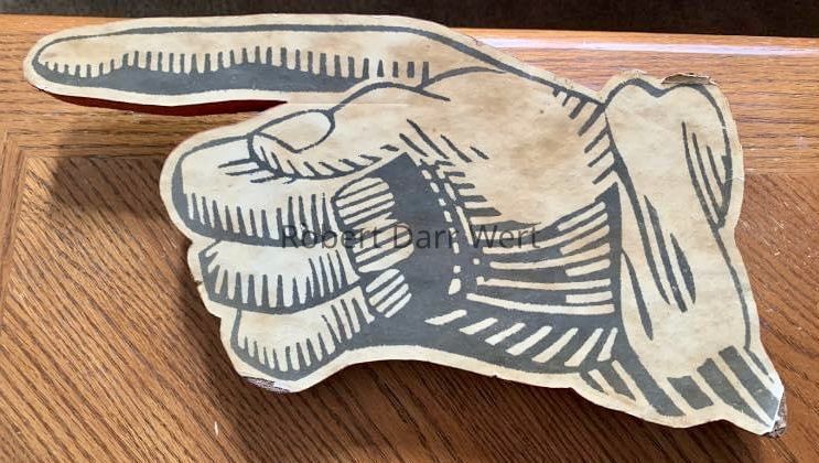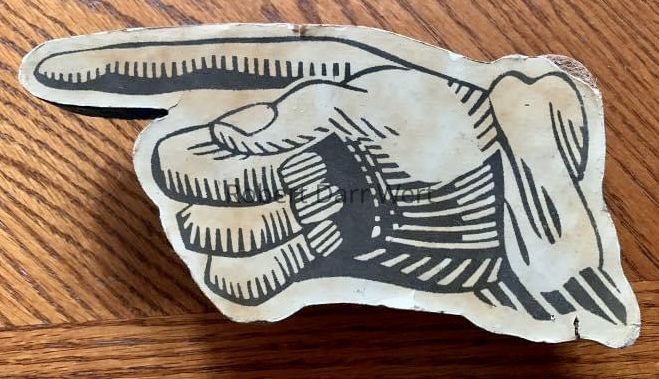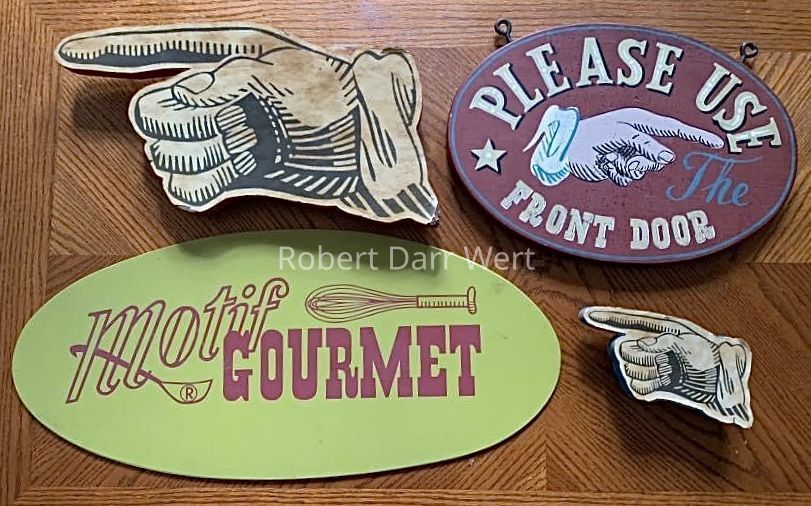 Signage from the in-house shop at the Country Prints workshop in Gill, Massachusetts, including two manicules (pointing hands or printer’s fists), an oval wayfinding sign, and an oval brand marker for Country Prints’ Motif Gourmet line of kitchen soft goods from the mid-1960’s.Made/Created