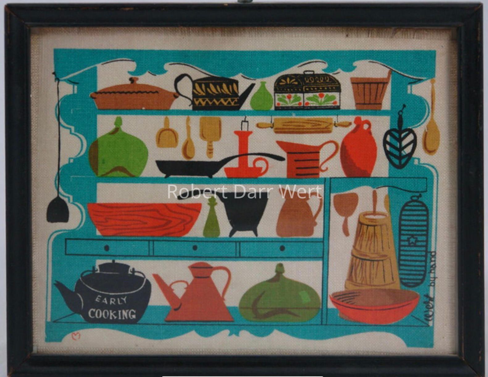 A six-color silkscreen print on off-white linen depicting an open hutch with shelves holding tools and cookware necessary to an early American kitchen. At lower left, a black tea kettle bears the title,“Early Cooking”. A matching napkin has not been documented.