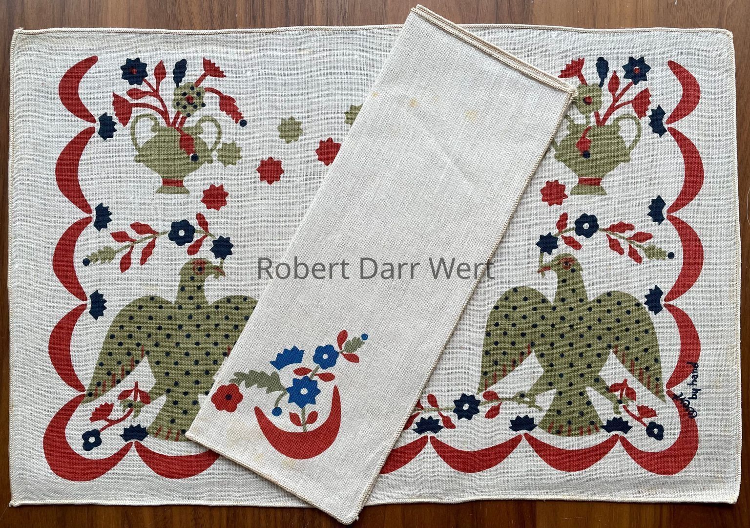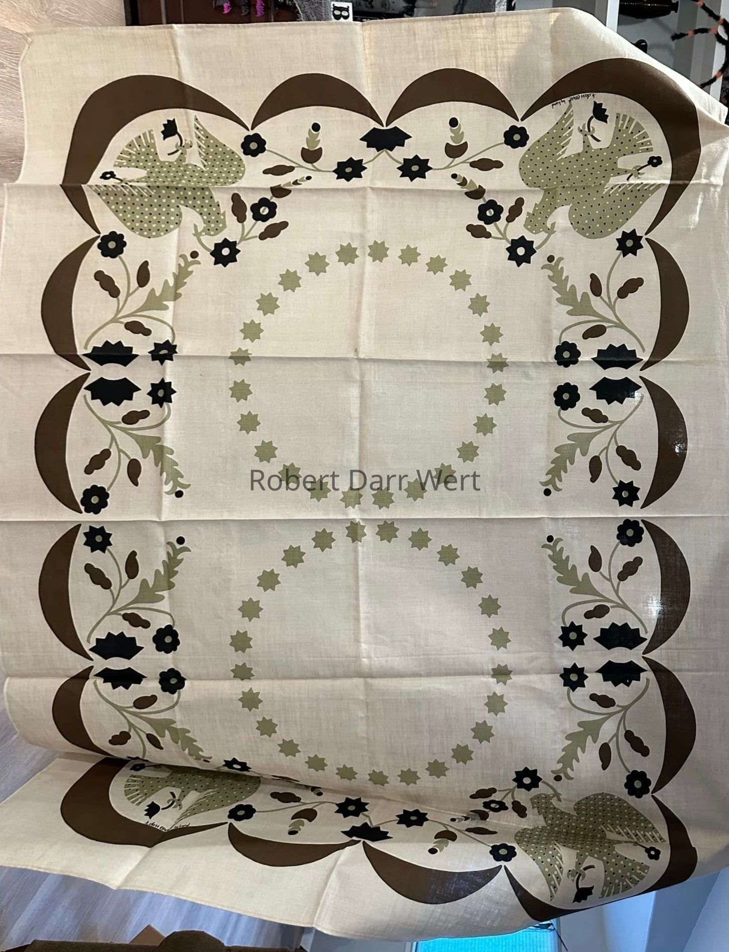 This tablecloth is listed in the January 1960 Country Prints price list in two sizes (52” x 52”, 52” x 72”), and in three colorways (blue, red, or brown). It also appears in the c.1960 brochure “Mat Sets by Robert Darr Wert/Country Prints”.