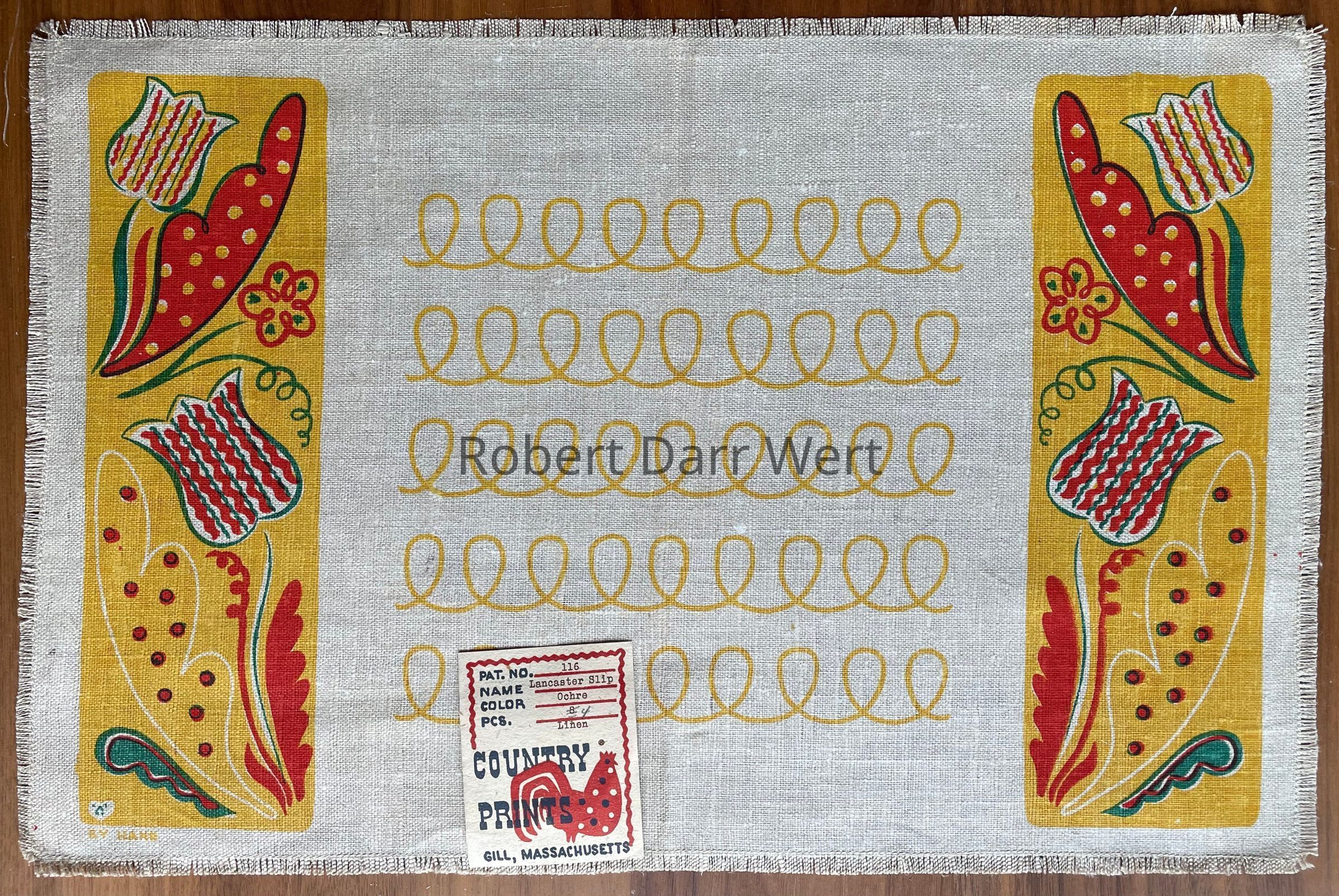 A placemat with a three-color silkscreen print depicting Wert’s interpretation of Pennsylvania “Dutch” folk art motifs in rectangular fields at left and right, with five rows of calligraphic scrolls between. The napkin bears a one-color print of scrolls to match the placemat.