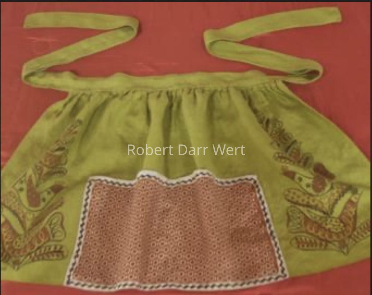 This apron is described in a c.1955 Country Prints price list, “(Trees of Calico Birds) in Brown and Black on solid Bottle Green.” It is also listed on the Spring 1958 Country Prints price list.Made/Created
