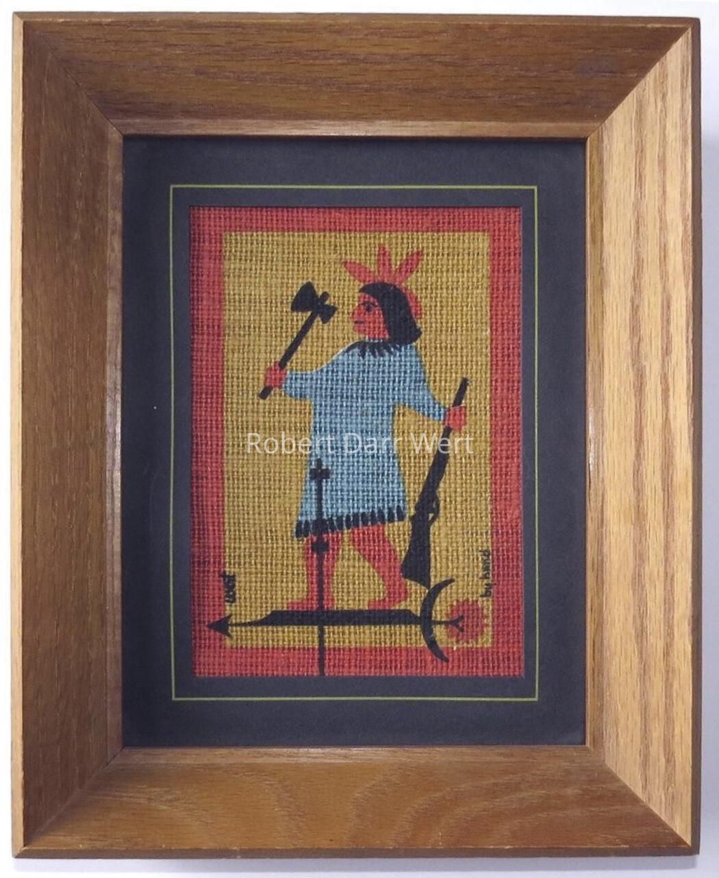 A four-color silkscreen print on linen burlap depicting an early American weathervane with a Native American figure holding a gun and a hatchet.