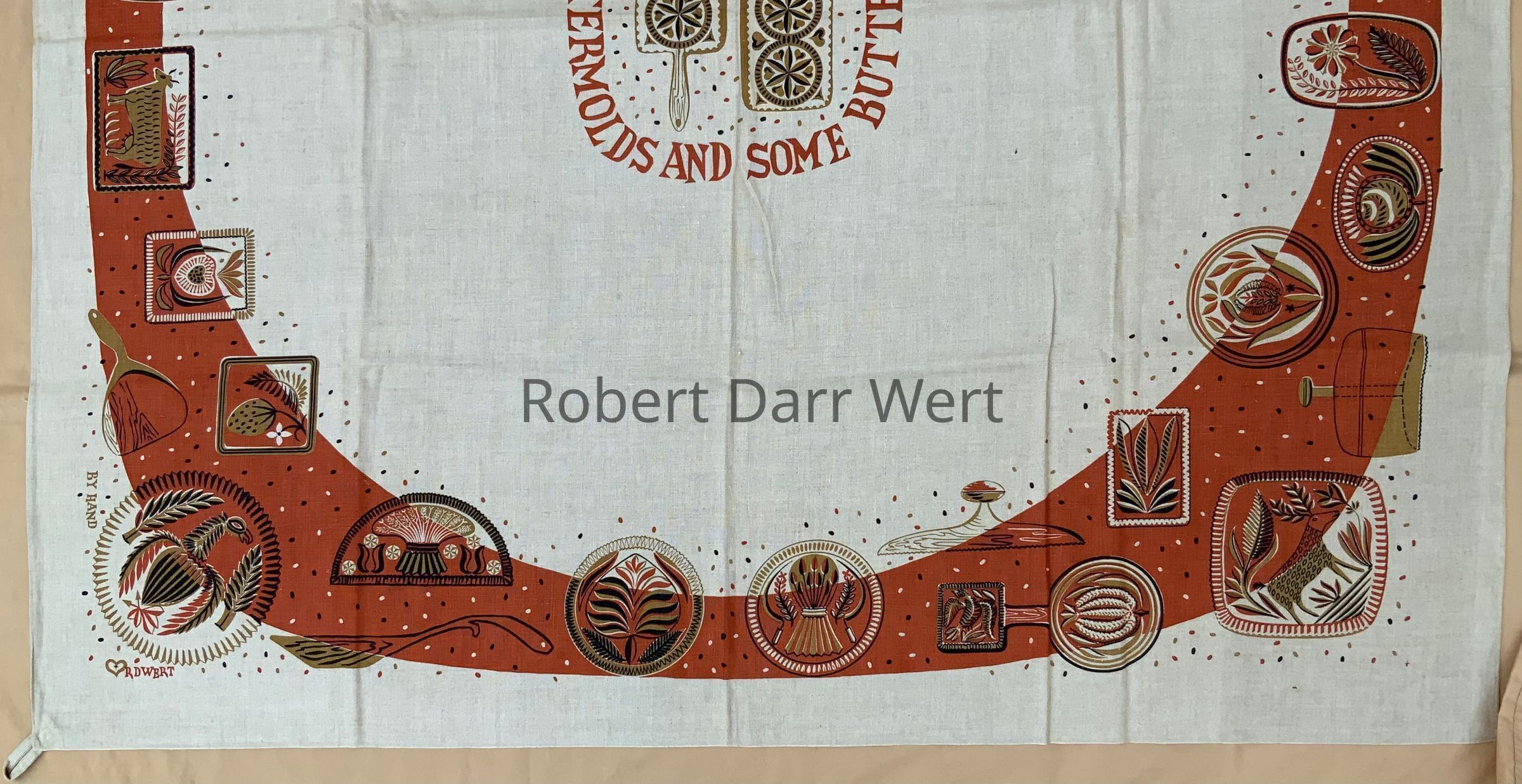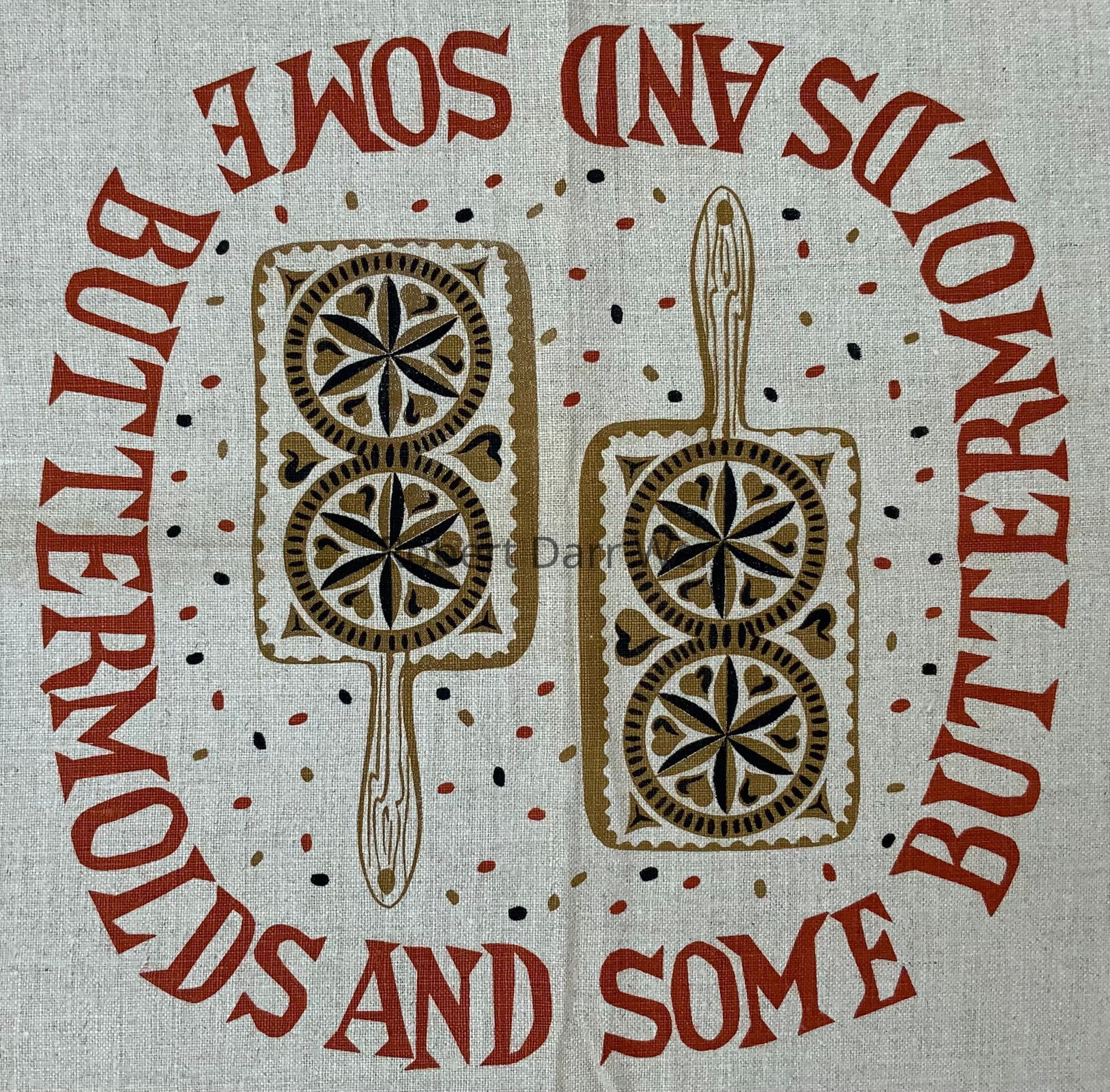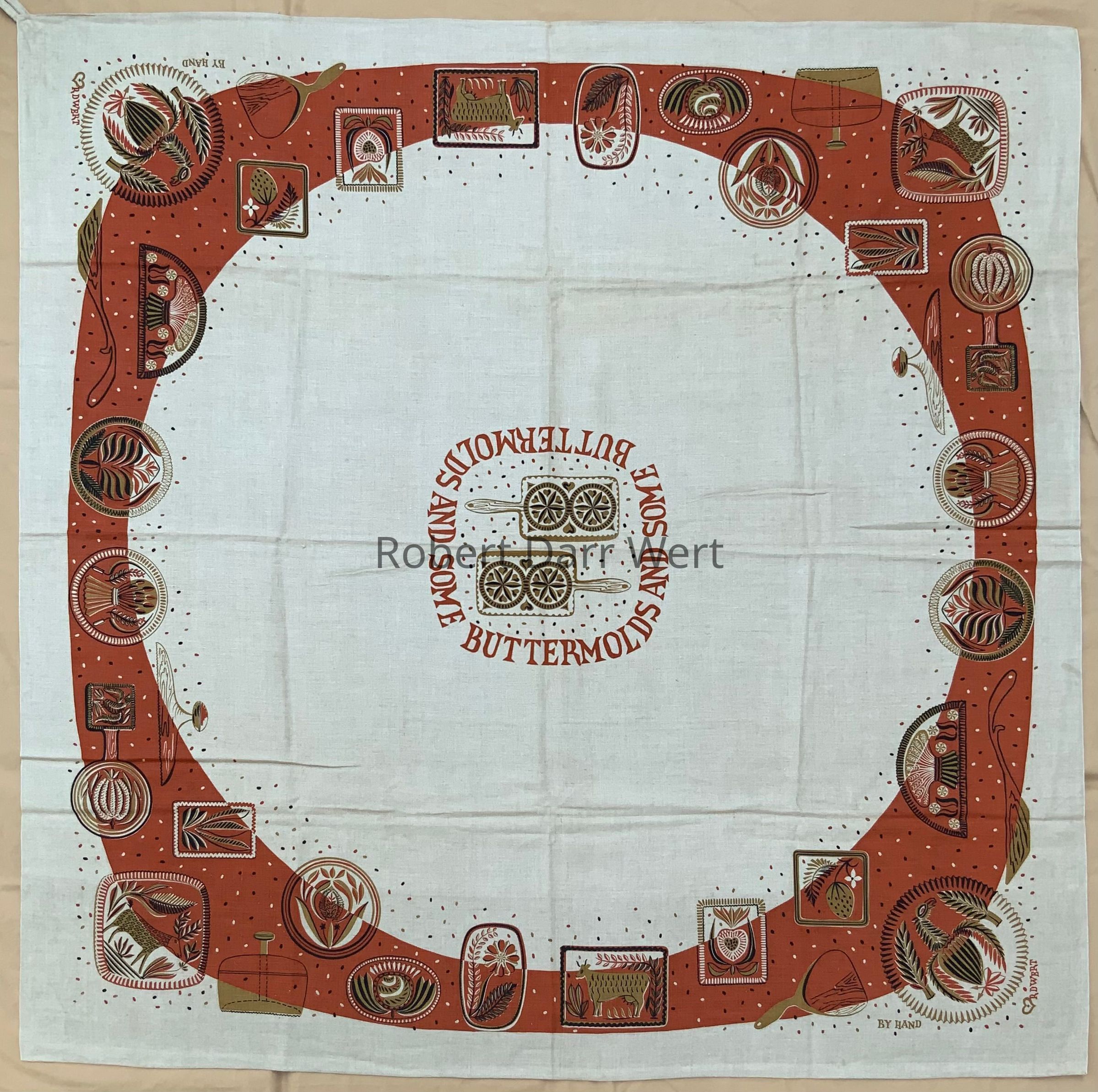 A tablecloth with a three-color silkscreen print on natural linen depicting numerous carved wood buttermolds set amongst brick red border. At center is a medallion framed with the repeating phrase, “SOME BUTTERMOLDS AND SOME BUTTERMOLDS…”.