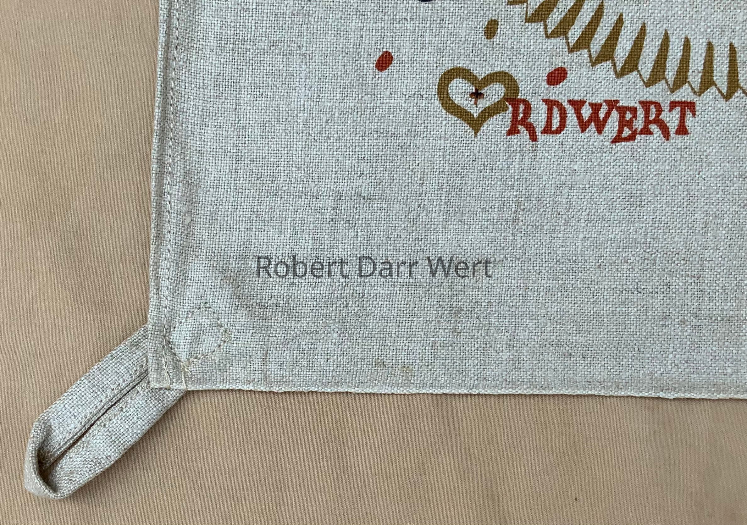 This tablecloth appears in the c.1955 brochure “Country Prints Mat Sets and Luncheon Squares by Robert Darr Wert”; see images. It was produced in three colorways. Placemat sized napkins printed with repeating black oval dots on solid color linen were also available.