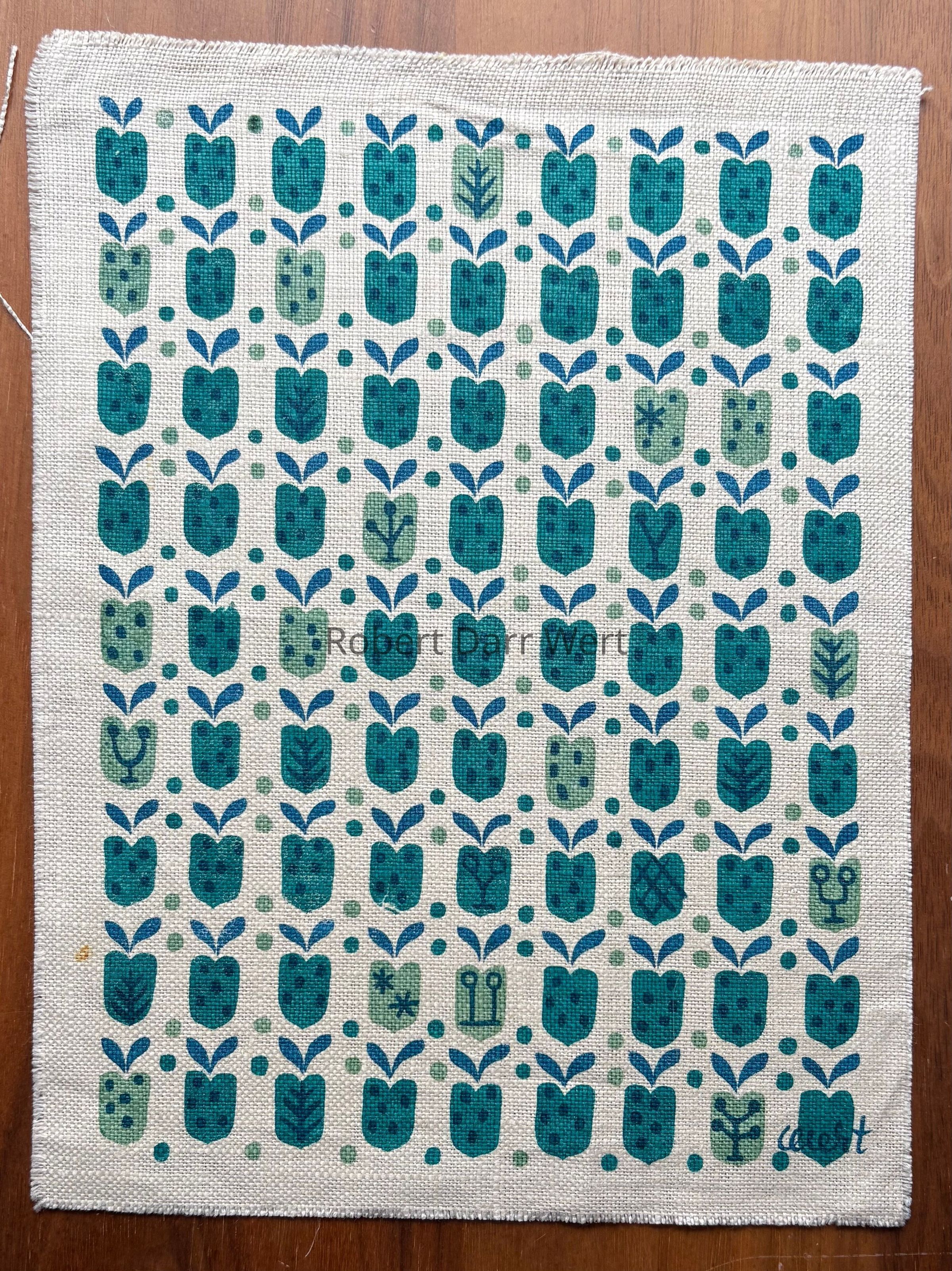 These cocktail napkins appear in the c.1955 brochure “I-Did-It-Myself Aprons by Robert Darr Wert/Country Prints” listed in two colorways: pink and aqua.