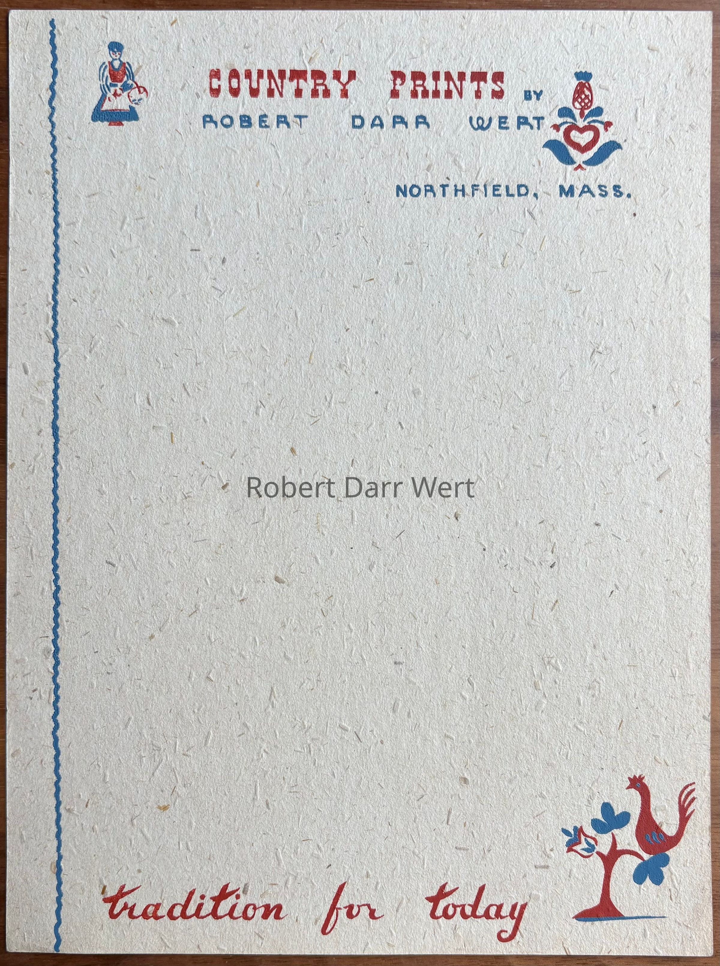“Country Prints by Robert Darr Wert, Northfield, Mass.”, in block print, and “tradition for today”, in script.Dimensions