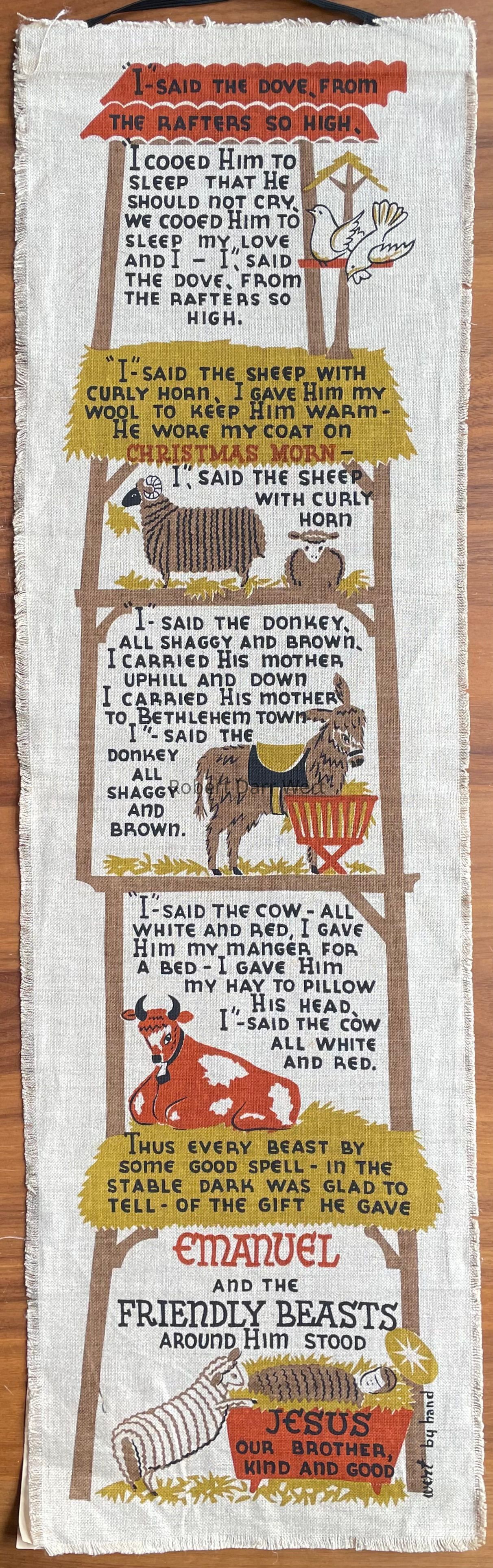 A wallhanging with a three-screen/four-color silkscreen print on off-white linen depicting verses from the Christmas song, “The Friendly Beasts”, telling the Christmas story from the point of view of the animals living in the barn where Jesus was born.