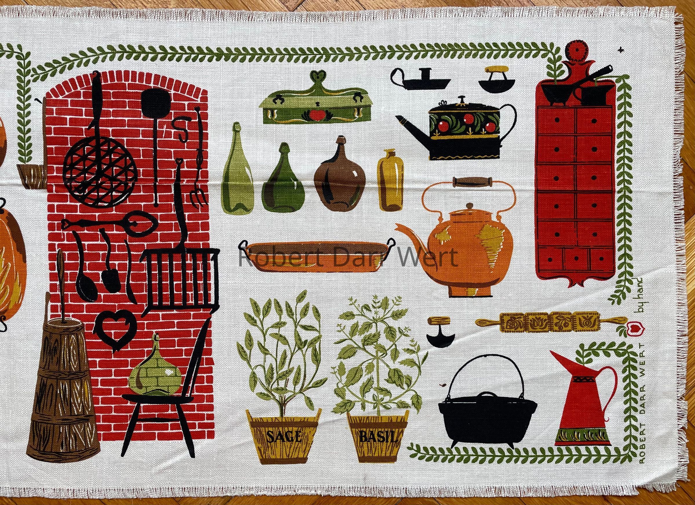 This table runner appears in the c.1953 brochure “Robert Darr Wert/Country Prints Kitchen Hangings”, and in a 1955 article about Robert Darr Wert and Country Prints in the art journal Design; see images. It is also included in The University of Connecticut Historical Costume and Textiles Collection, gift of the artist, 1953; see web link.