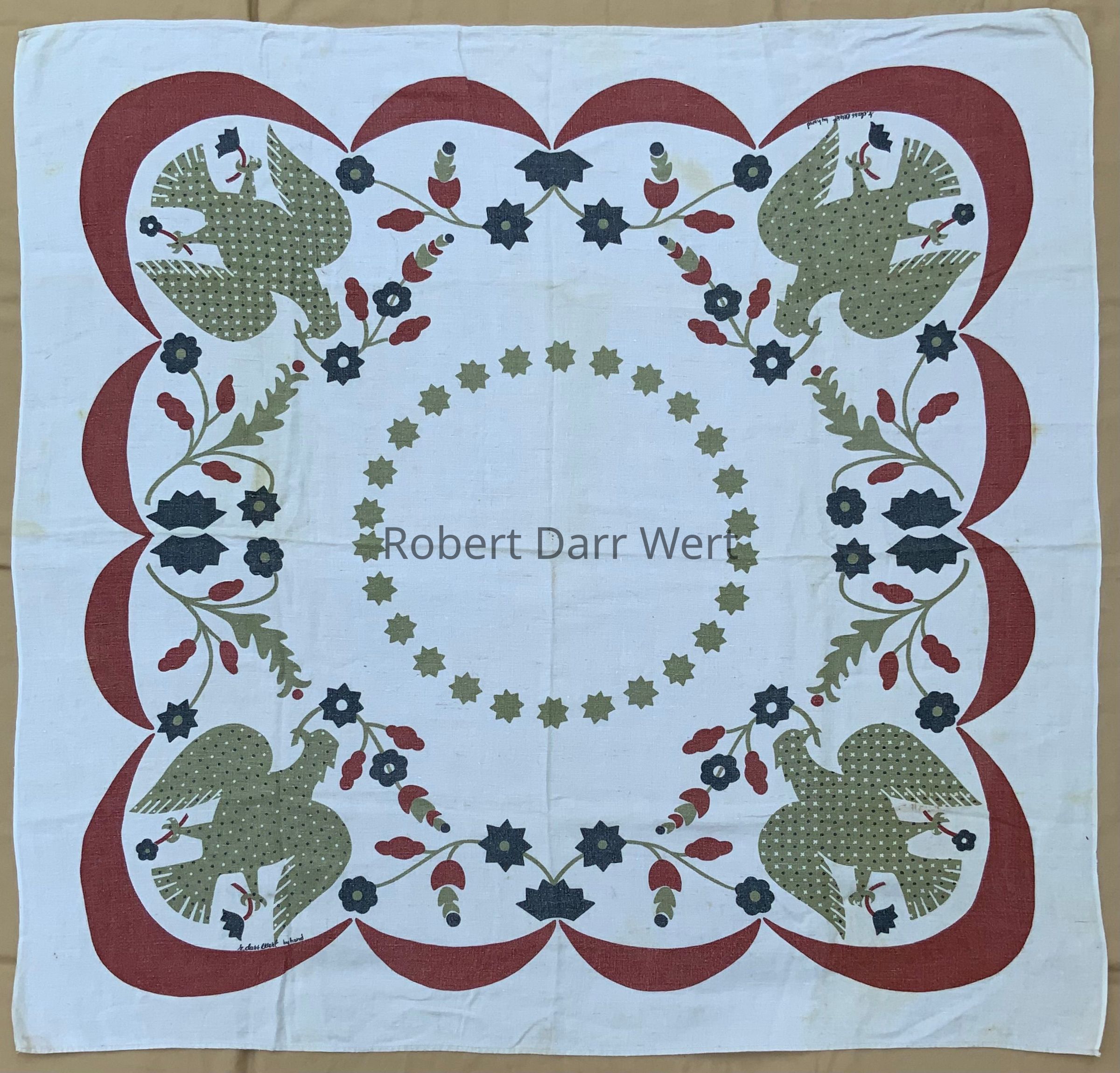 A tablecloth with a silkscreen print depicting eagles, swags and flower motifs from an early American appliqué quilt.