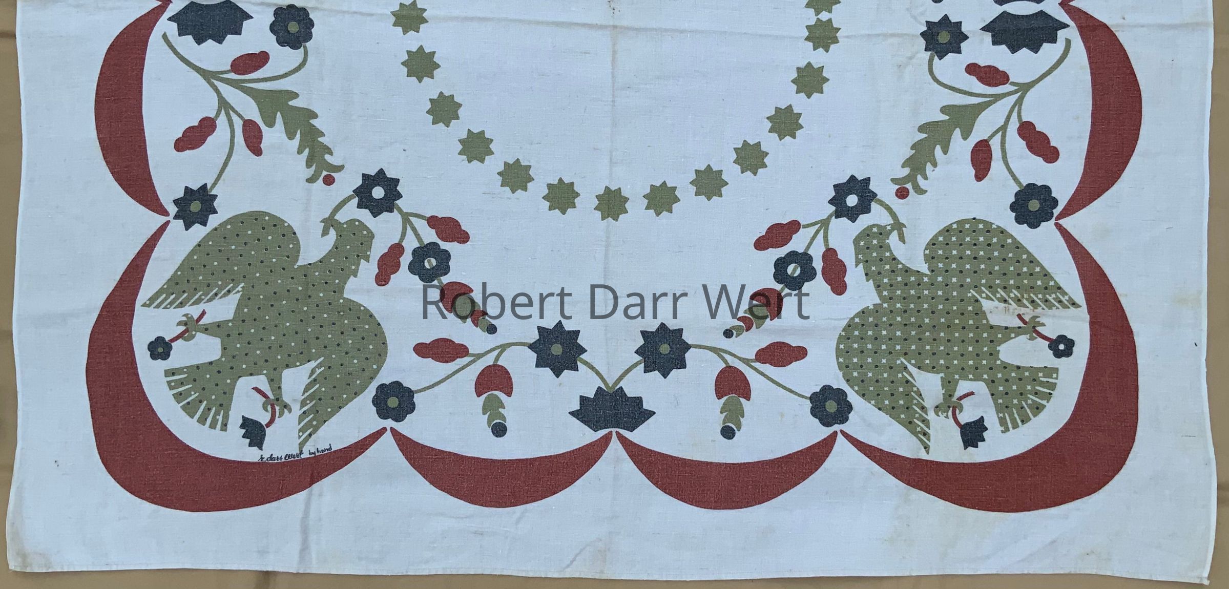 “r. darr wert by hand”, lower left corners of narrow ends.Material