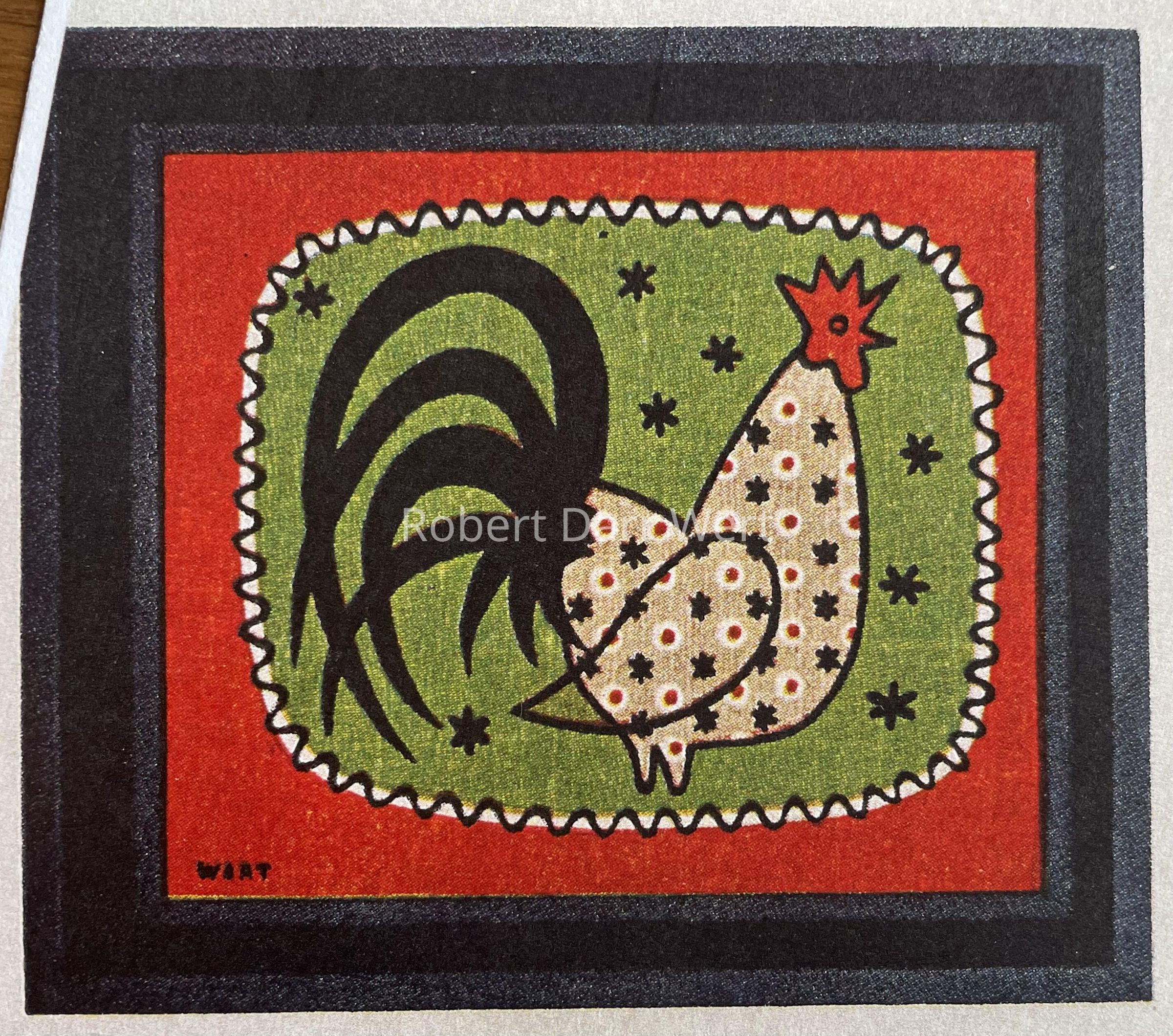 This pair of prints appears in the brochure “Country Prints in Frames”, c.1955. The rooster print is featured in a cover story about Robert Darr Wert and Country Prints in the journal Design, 1955; see images.