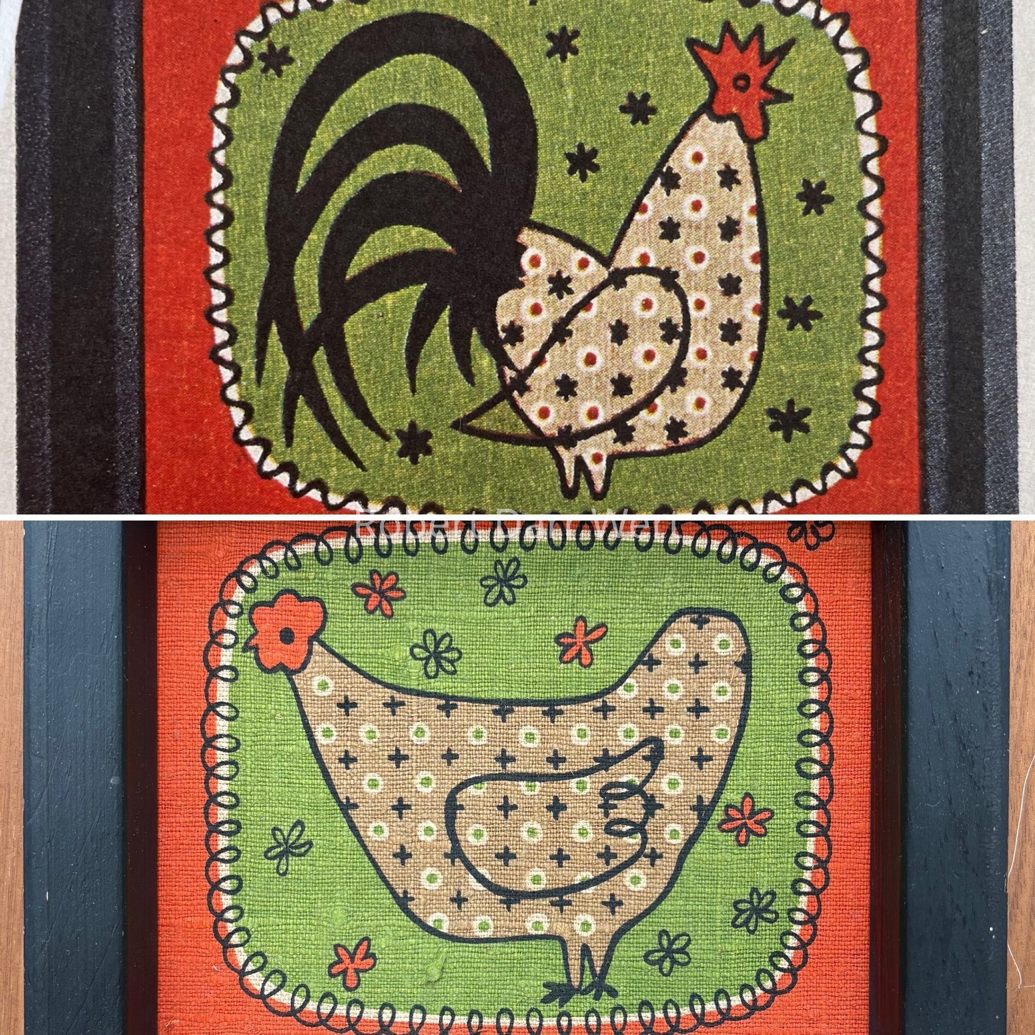 A pair of four-color silkscreen prints on off-white linen, one depicting a hen and the other a rooster.