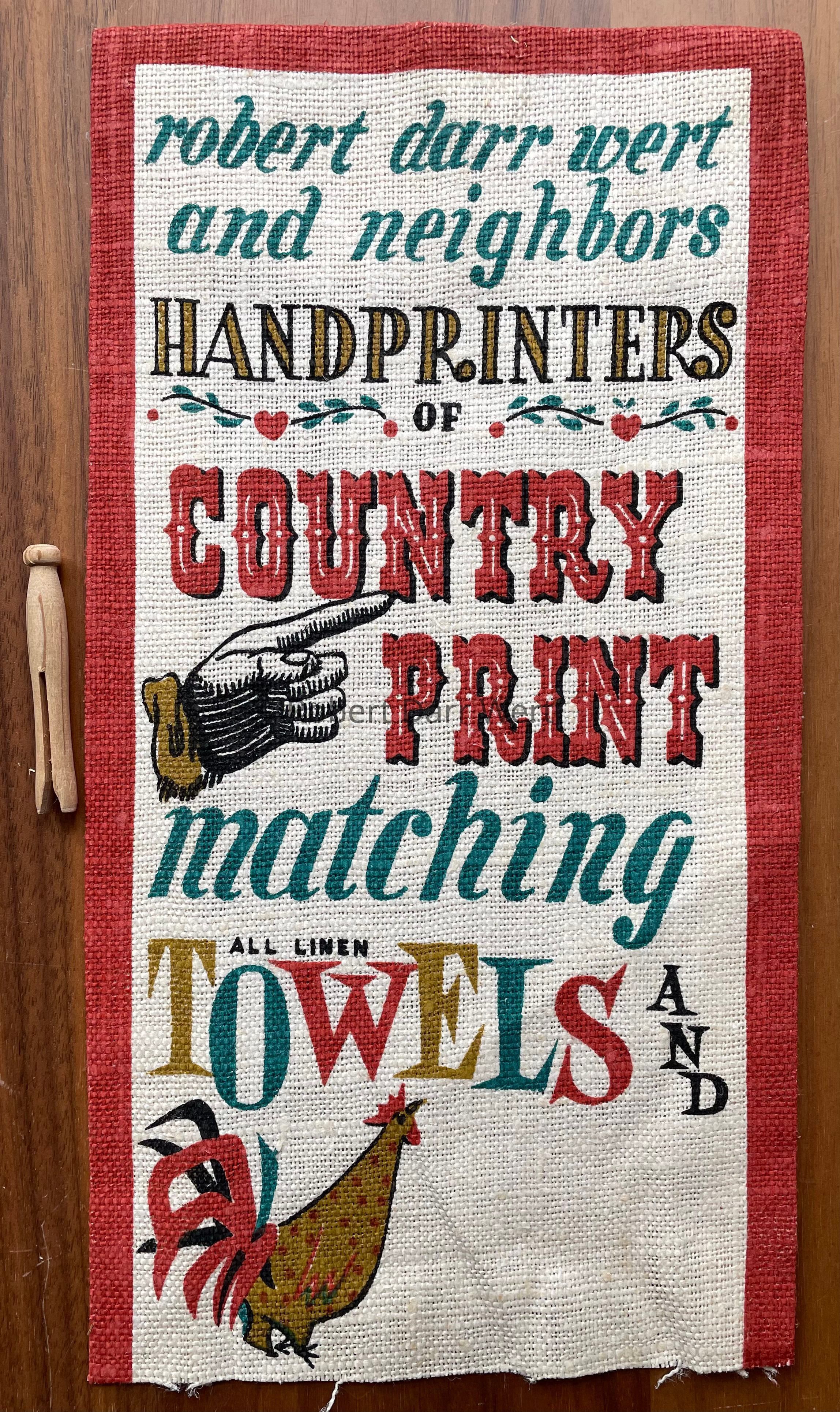 A wholesale/retail sign silkscreen printed in four colors on white linen advertising Country Prints matching towels and… [likely tiles and aprons]. The blank space at the bottom of the composition allowed space for a small display block to advertise a matching product, such as a tile. The raw cut at the bottom of the sign was intentional.