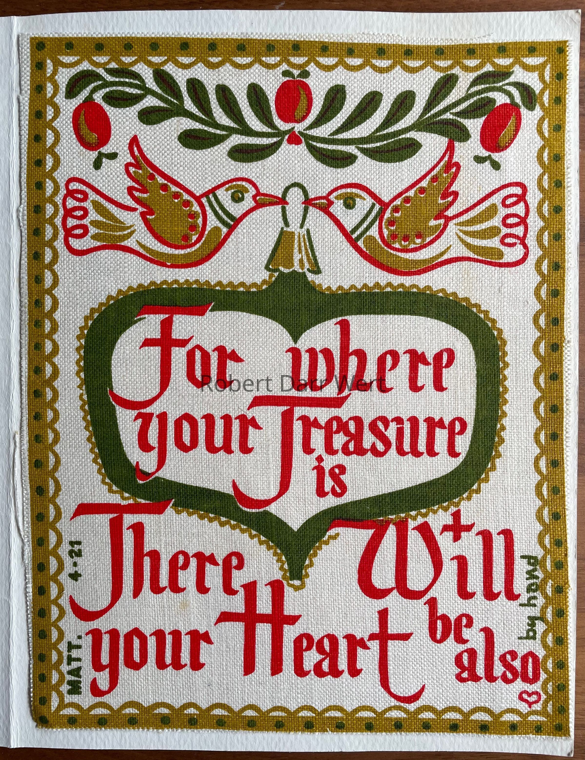 A 1963 Wert family Christmas greeting comprised of a three-screen/four-color silkscreen print on linen within a textured white cardstock note folder. The note folder is printed with the Wert family names: Robert, Margaret, Sara Darr and Jerry.