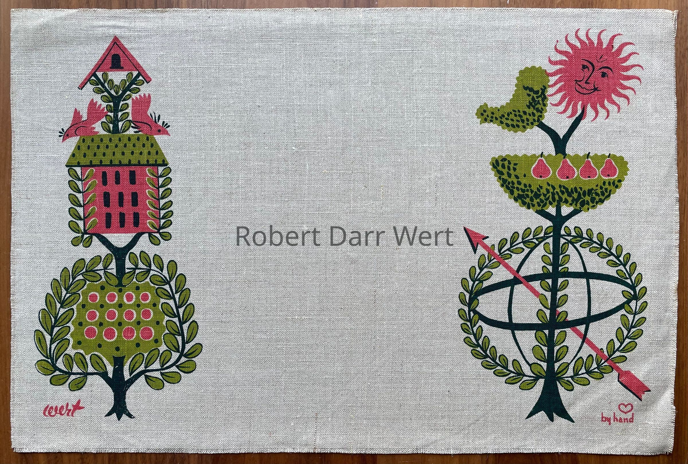 This placemat is described on the Spring 1958 Country Prints price list, “141 Garden Whimsey — Espaliered tree design — Pink & Turquoise on White — Green on Tan.”