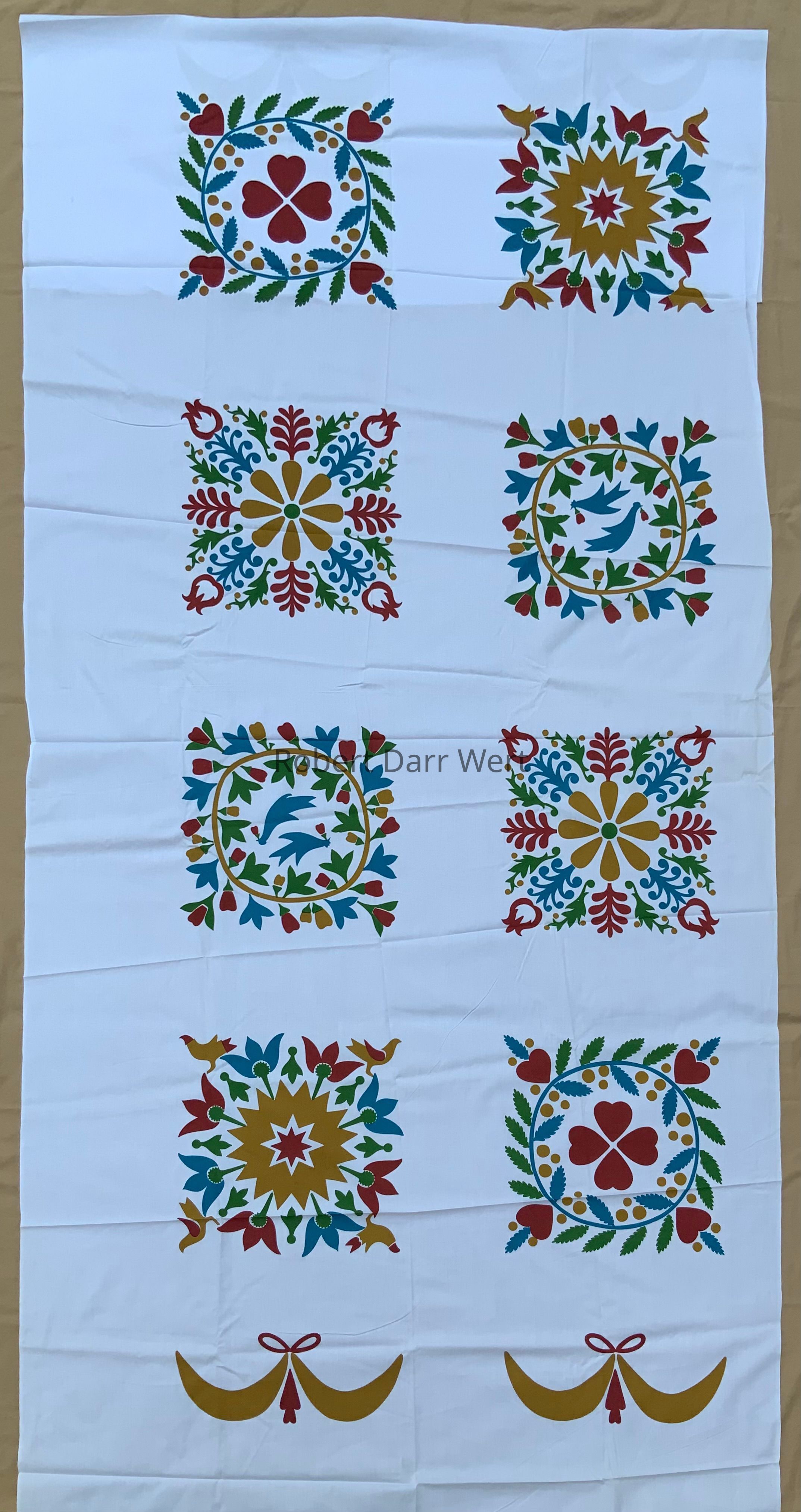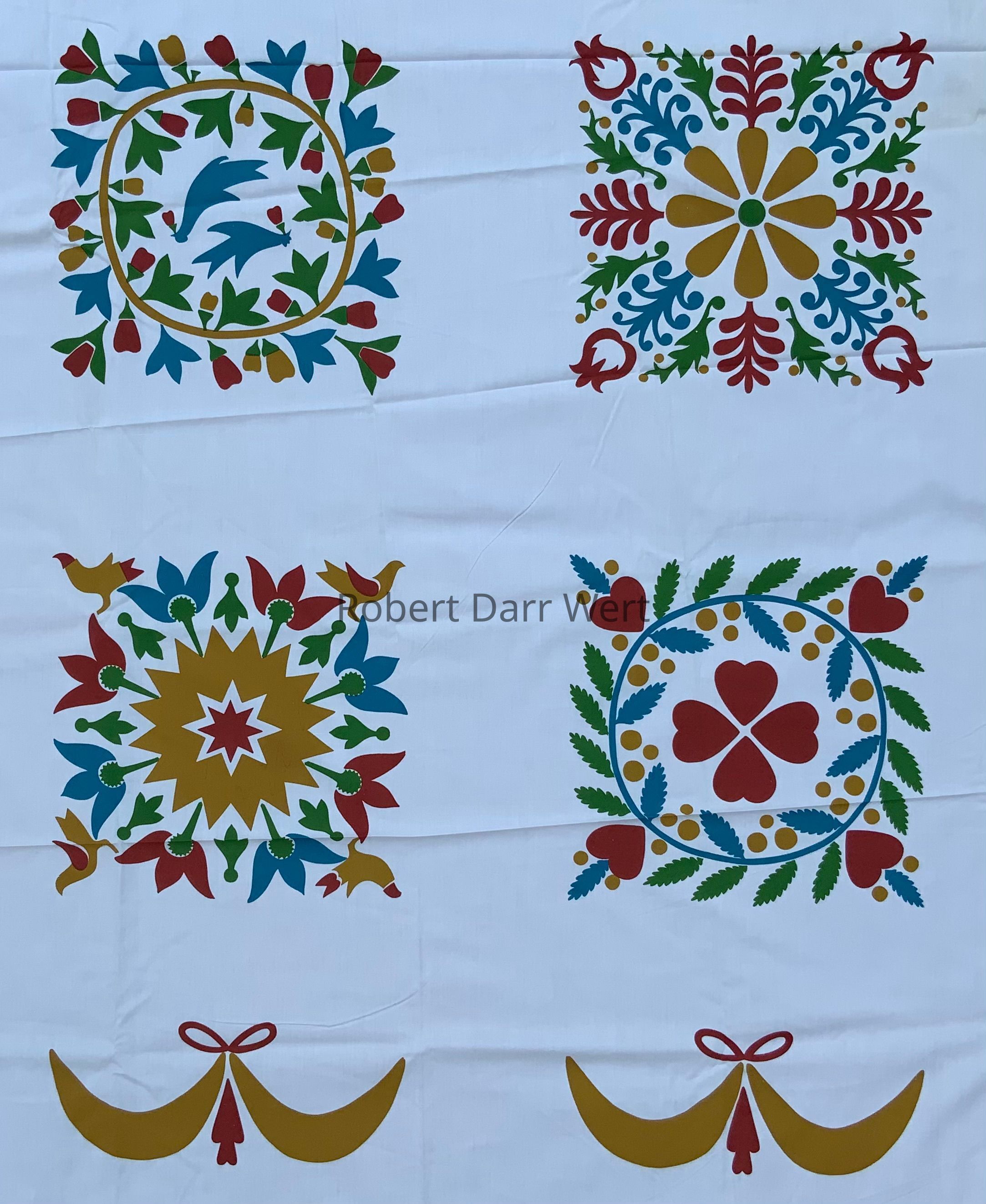 A four-color silkscreen print on white cotton percale depicting imagery inspired by early American appliqué quilts. Designed by Wert and produced as quilt tops for an outside company.Made/Created