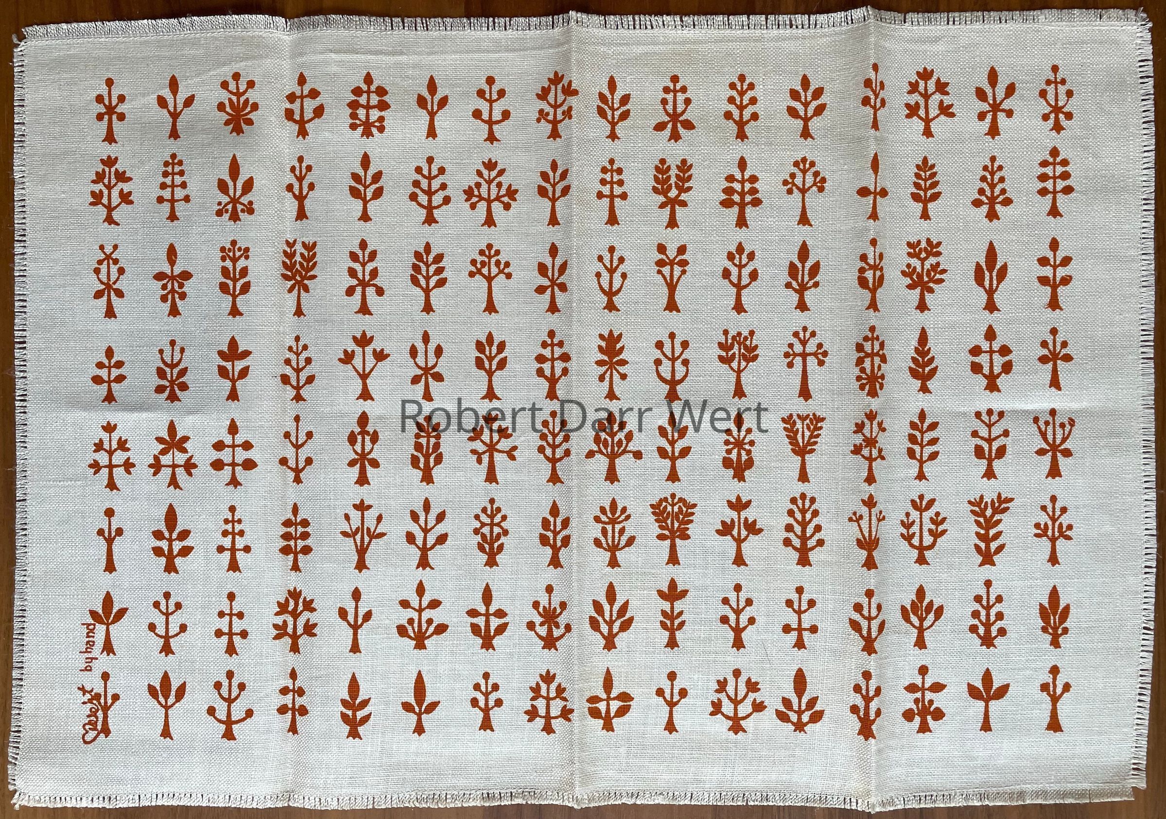 This set appears in the c.1955 brochure “Country Prints Mat Sets and Table Squares by Robert Darr Wert” in one colorway: copper, black and green on white linen; with two napkin choices: black print on herb green linen, and copper on white linen. It is described on the Spring 1958 Country Prints price list in three colorways and two linen choices, “132 Herbs — Herb plants in early pots — Blue or Green on White — Brown on Tan.”