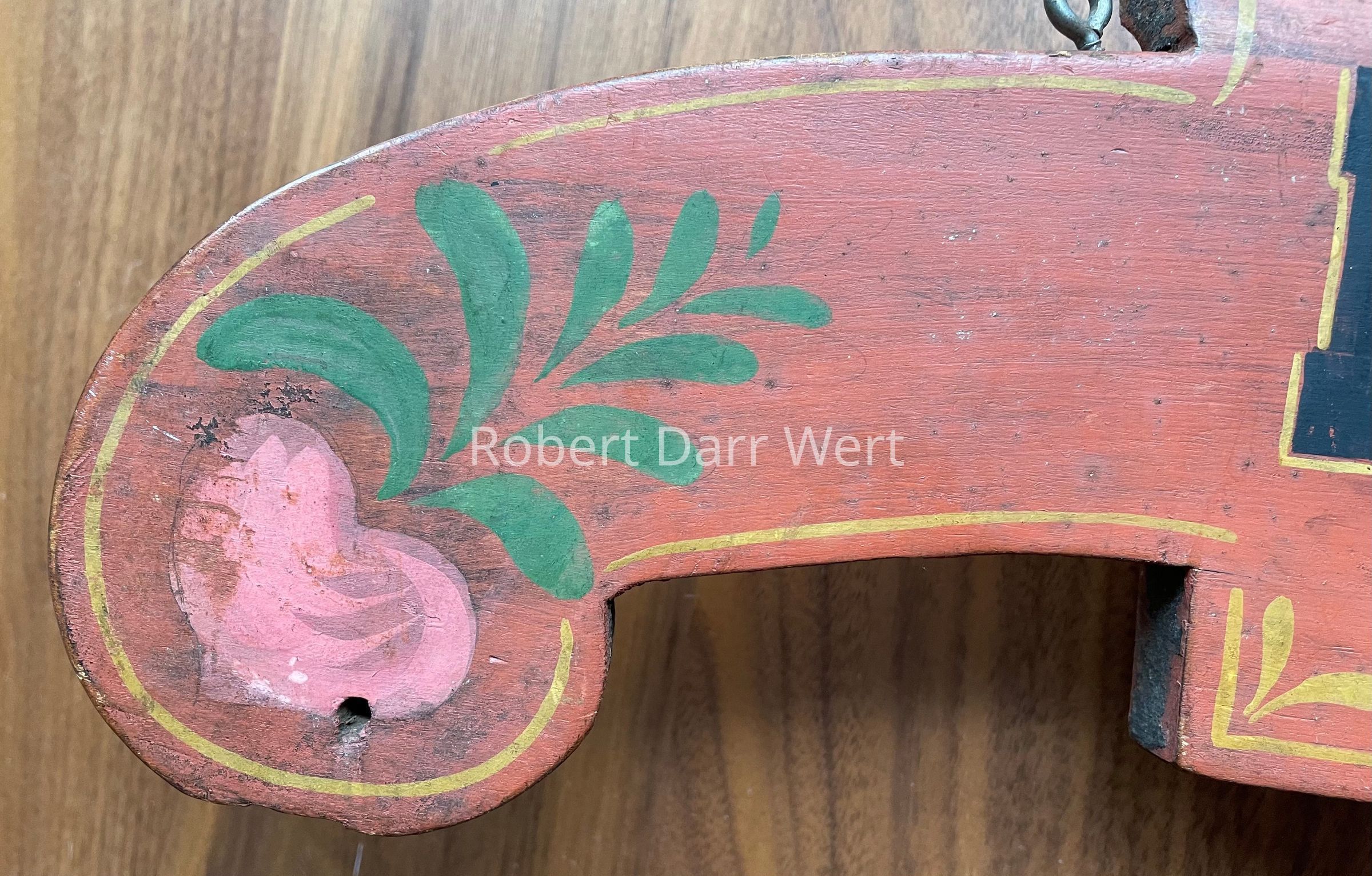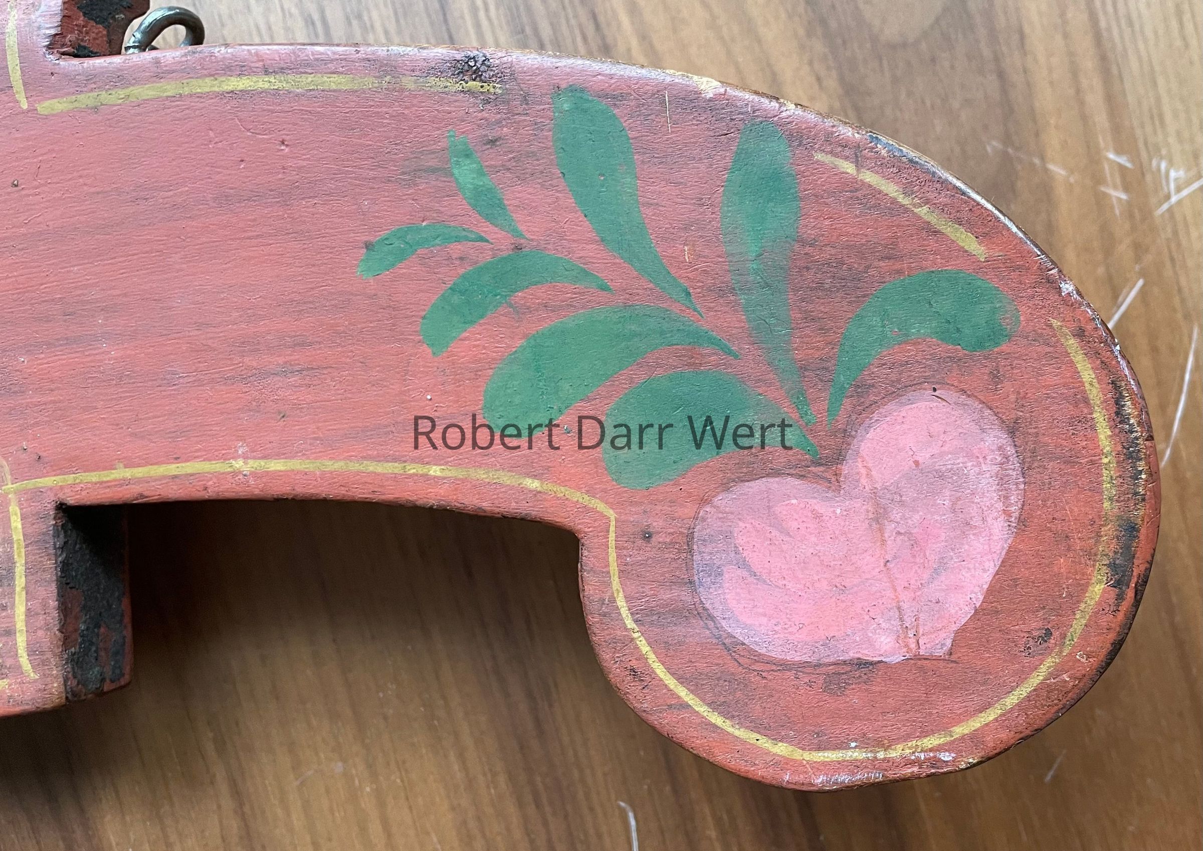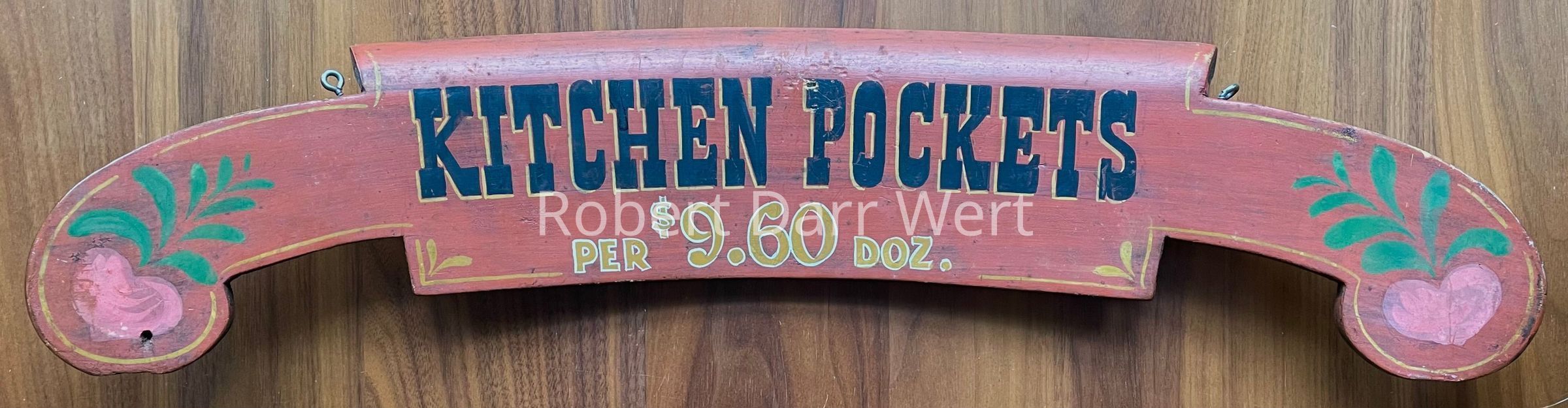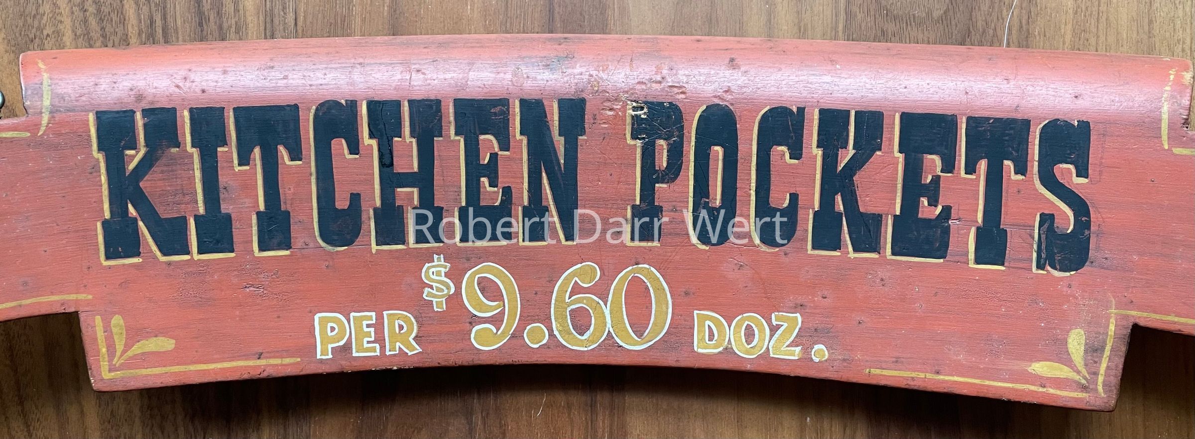 Hand painted pricing signage promoting Country Prints’ Kitchen Pockets wallhangings. The sign is painted on the former top rail of a chair and bears screw eyes for hanging in trade show booths.