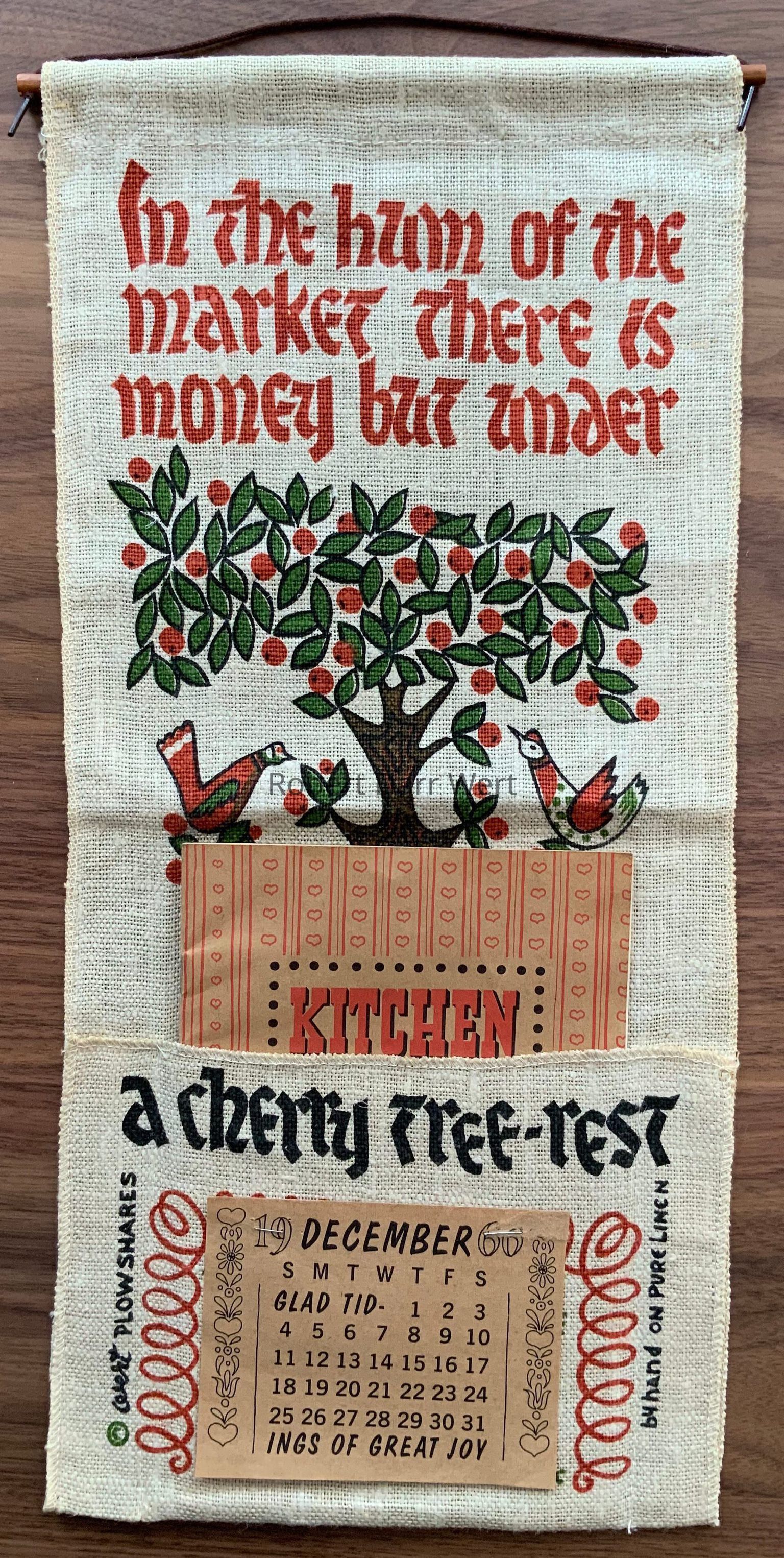 Introduced in 1964 for the 1965 calendar year, two Kitchen Pockets brochures state, “BEST NEW IDEA IN A LONG TIME!”, and, “A three in one idea and it’s completely new.” Kitchen Pockets wallhangings are silkscreen printed wallhangings with a pocket at the base. The pocket contained a self-published cookbook with eight recipes from the American Dairy Kitchen. A twelve page paper calendar was stapled to the face of the pocket. Kitchen Pockets were introduced along with Plowshares wallhangings.