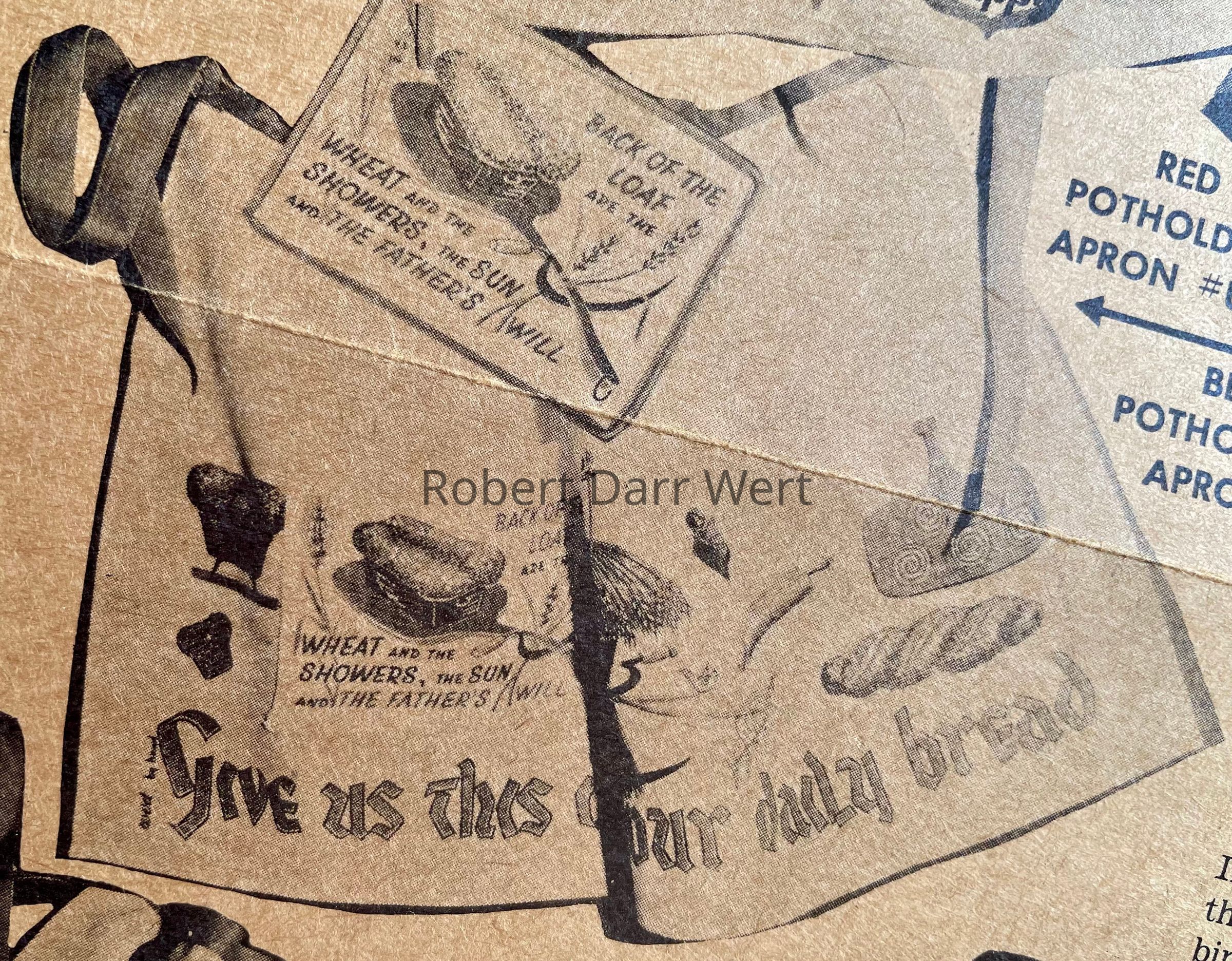 An apron with a three-color print depicting materials and tools for turning wheat into bread. Across the lower section of the composition is a line from the Lord’s Prayer, “Give us this day our daily bread”. On the patch pocket and potholder are lyrics from the Christian hymn “Back of the Loaf” by Maltbie D. Babcock, “Back of the loaf are the wheat and the showers, the sun and the Father’s will”; see web link.