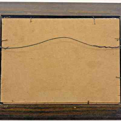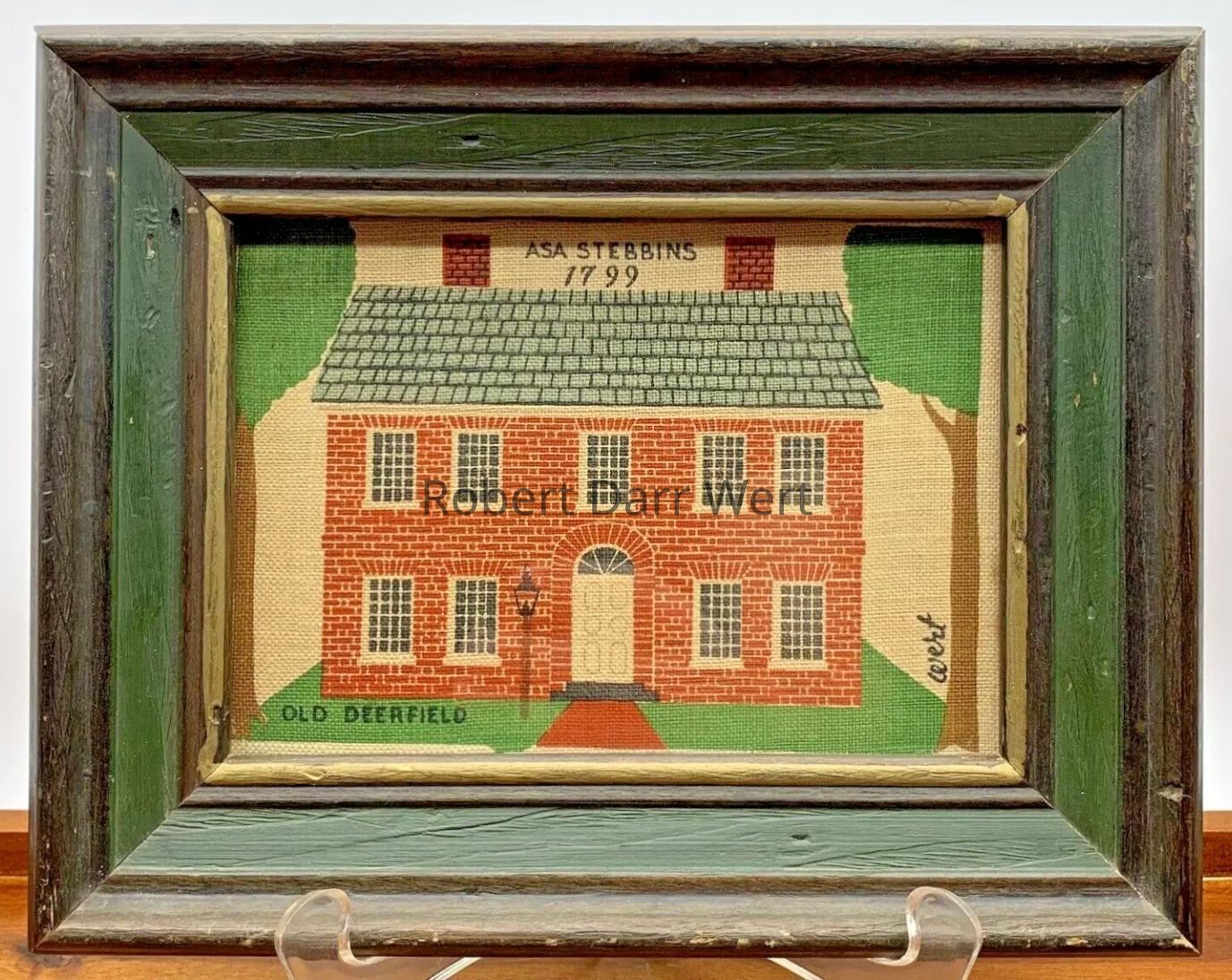A silkscreen print on linen dry-mounted to chipboard. Imagery depicts the brick Asa Stebbins house at Old Deerfield Village (now Historic Deerfield) in Deerfield, Massachesetts.