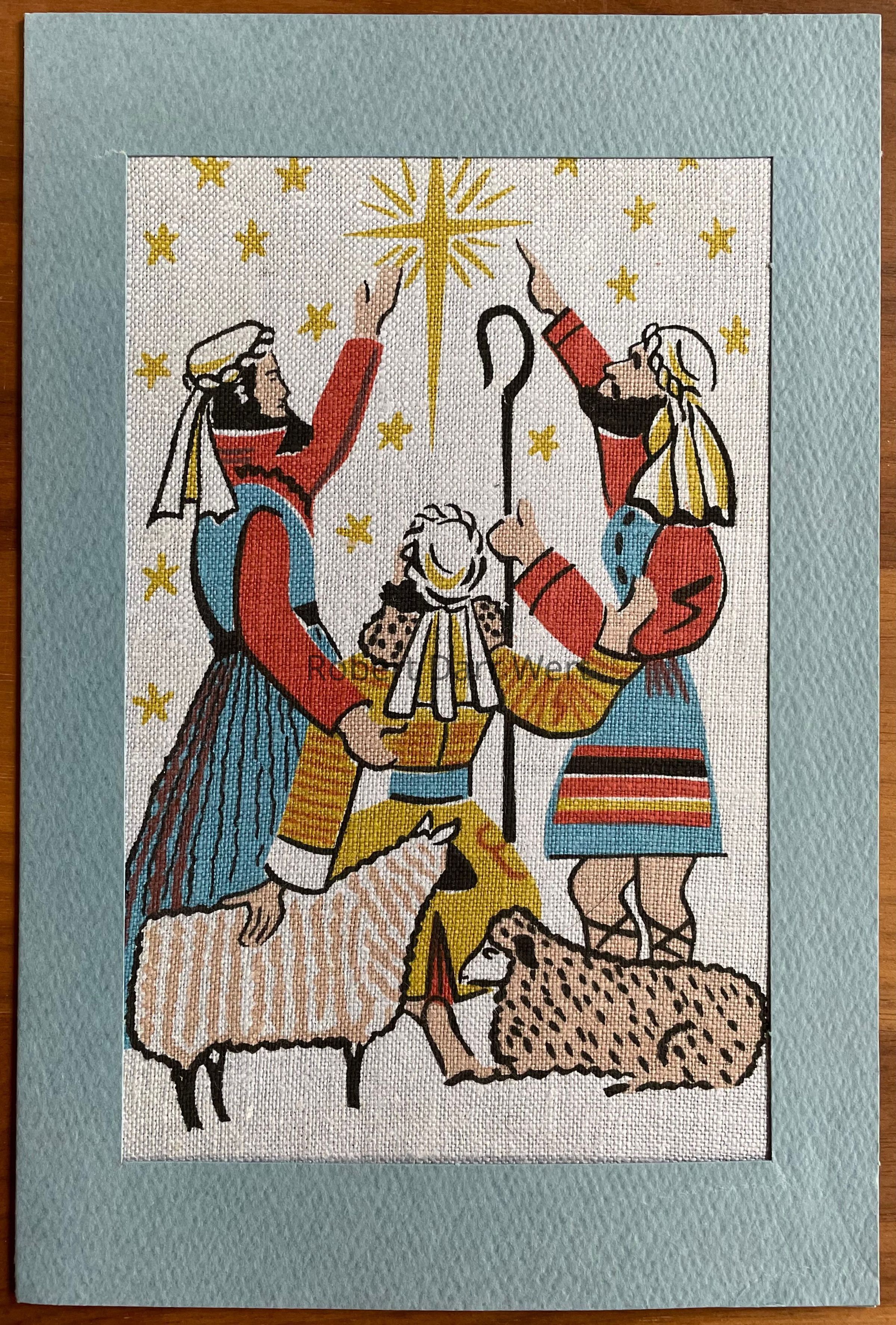 A five-color silkscreen print on light blue linen depicting three shepherds on Christmas night, looking skyward toward the Christmas star, two sheep at their feet. The linen print is glued within a dye cut Strathmore notecard in blue-gray.