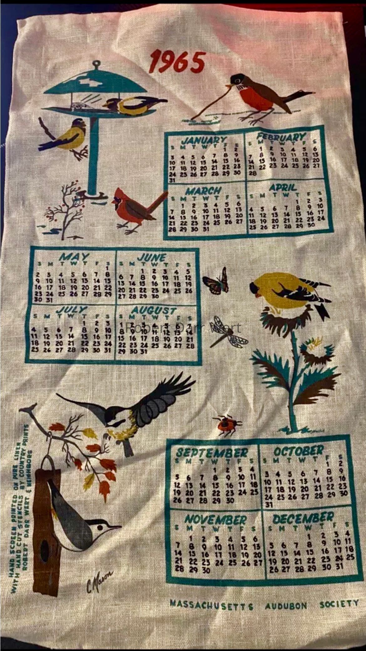 A 1965 Calendar towel printed by Country Prints for the Massachusetts Audubon Society (MAS). The print is signed by artist C. Mason. This is one of two calendar towel designs produced for the MAS in 1965.