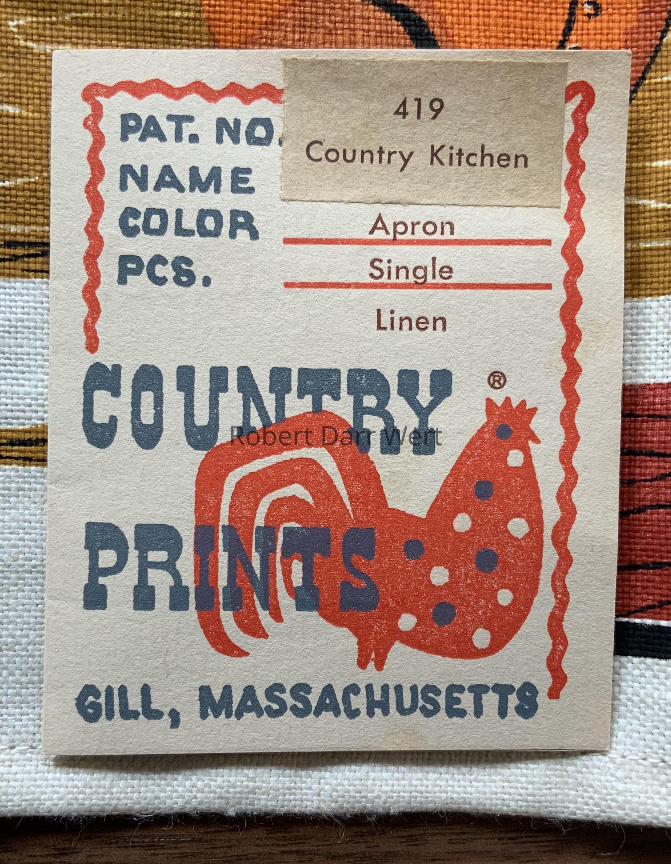 This apron is listed in the Spring 1958 and January 1960 Country Prints price lists, and appears in the c.1960 brochure “Mat Sets by Robert Darr Wert/Country Prints”.
