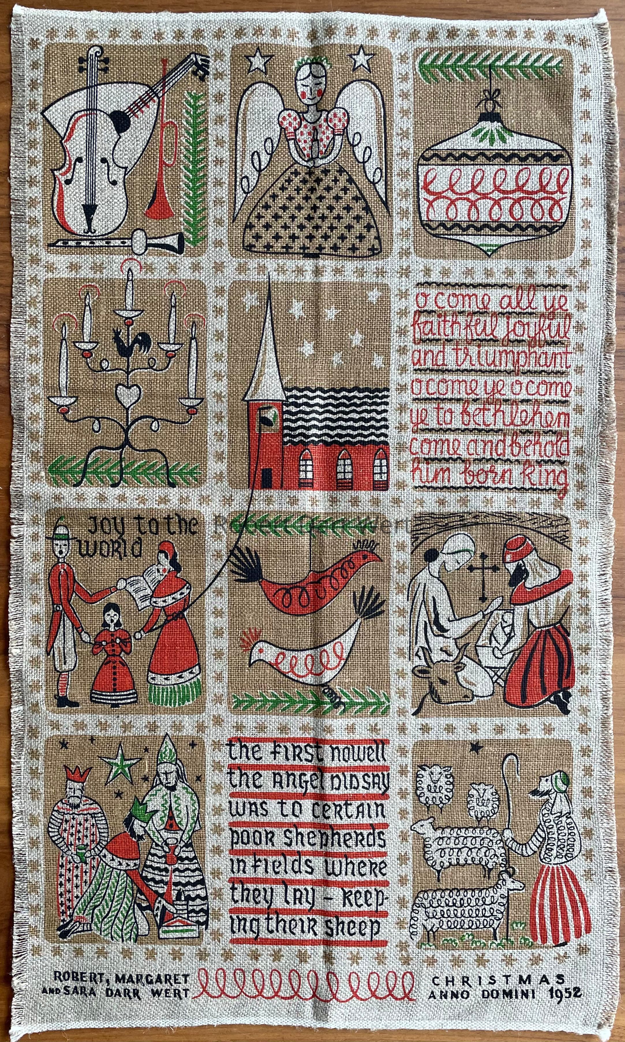 This is a four-color silkscreen print on natural linen depicting religious and secular Christmas scenes. The composition is divided into twelve panels (possibly symbolic of the twelve days of Christmas) with illustrations of the Holy Family, a shepherd and his flock watching the Christmas star, the three kings, musical instruments, glass Christmas ornaments, a candelabra, a church, and a family singing Joy To the World while ringing the bell in the adjacent church tower.