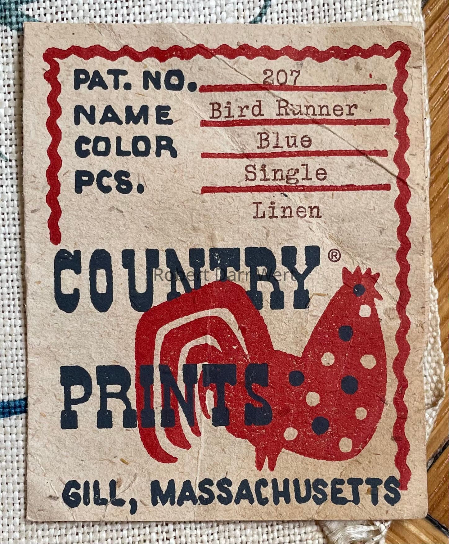 A c.1955 Country Prints price list describes this print, “Calico Country Print Birds for yesterday’s kitchens and today’s. Red, Blue or Brown.”