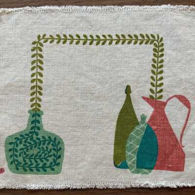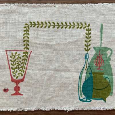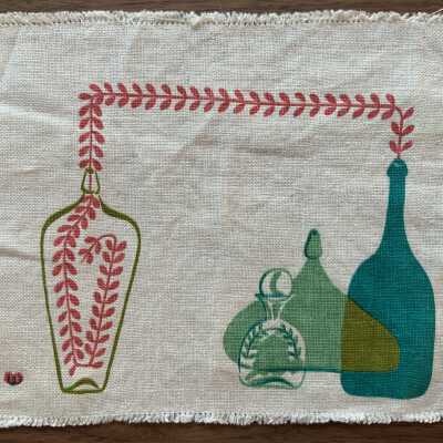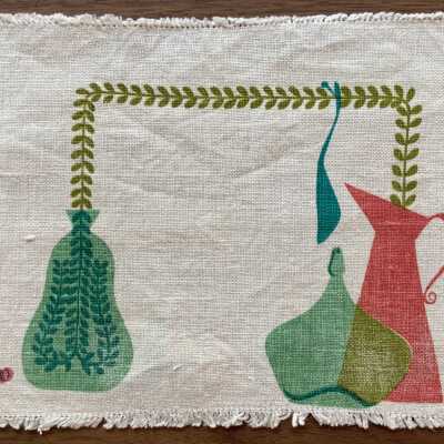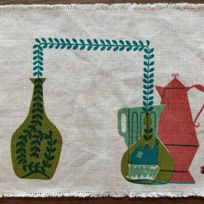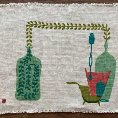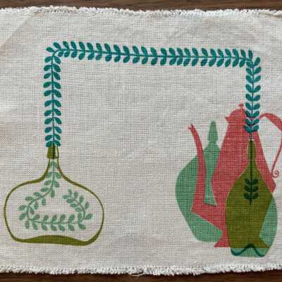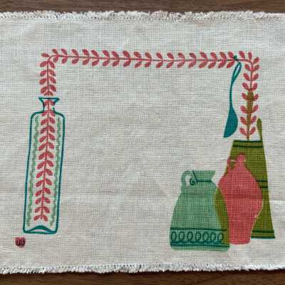 These cocktail napkins appear in the c.1955 brochure “I-Did-It-Myself Aprons by Robert Darr Wert/Country Prints”, and is described in a c.1955 price list, “ 316 New Vines in Old Bottles — Enough said, in pink, turquoise, light aqua and bottle green on white linen, 7 x 9…Set of eight each different.”