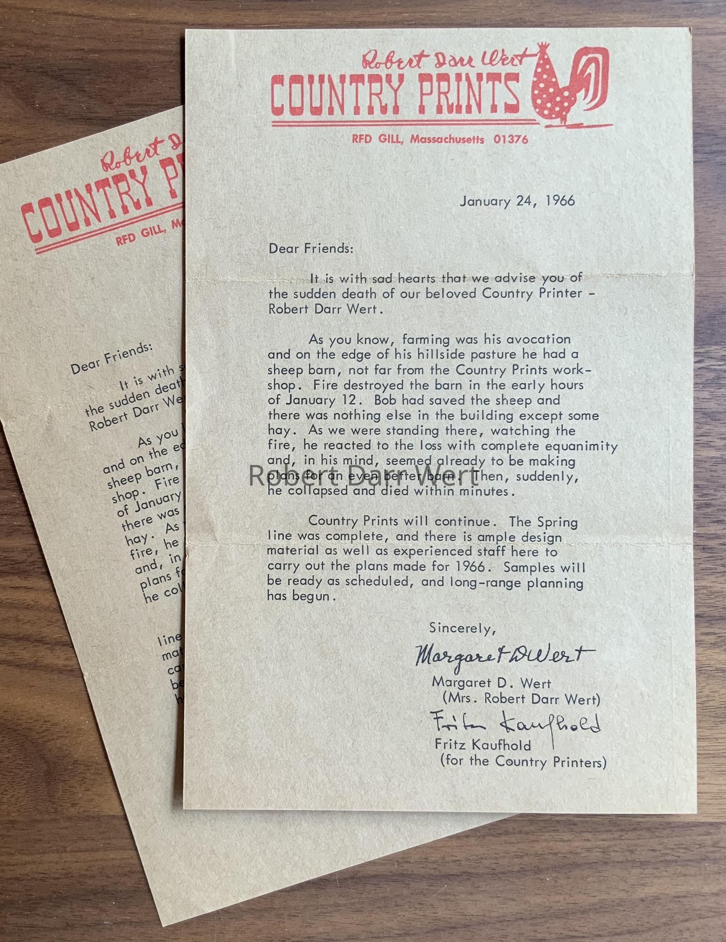 The letter, dated January 24, 1966, was used to inform the many Country Prints retailers and suppliers of Bob’s untimely passing while assuring them of the company’s continuation.Inscription/Signature/Marks