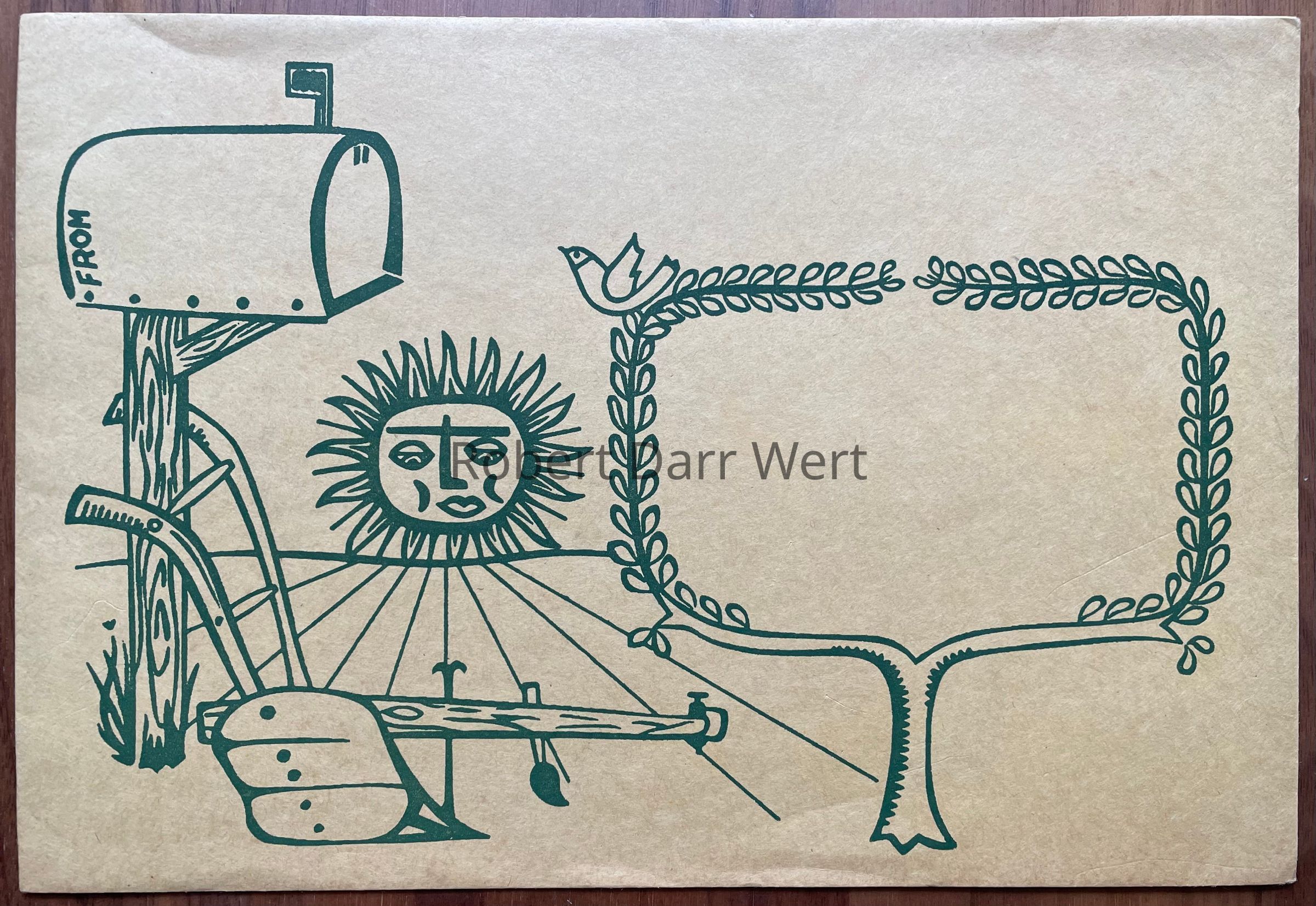 A yellow shipping envelope with a one-color silkscreen print in green depicting a mailbox (with “from” for the return address), a plow, a radiant sun overlooking a plowed field, and an espaliered tree with its branches bordering the address field.